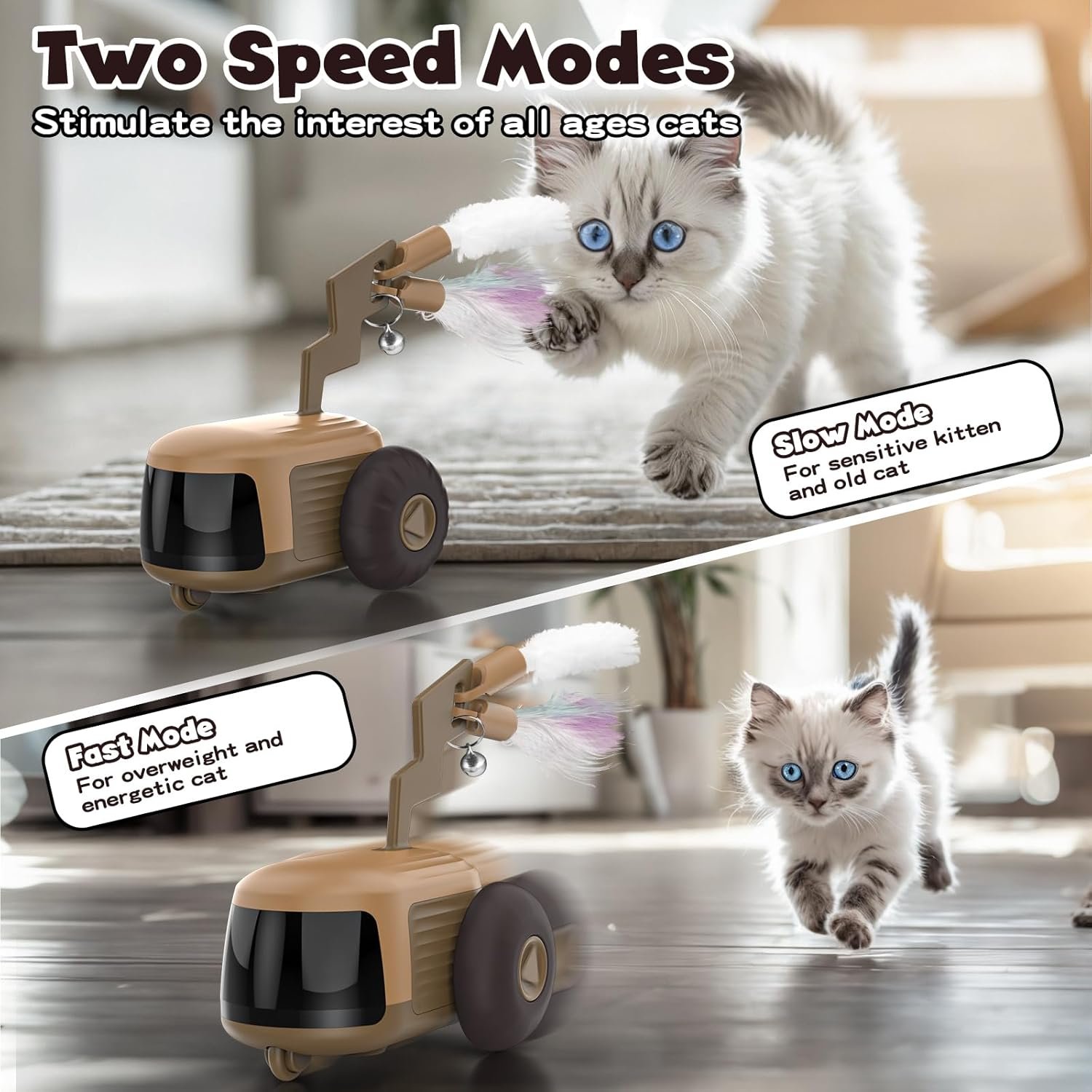 Two-Speed Modes: Our cat enrichment toys are available in both fast and slow modes. Specifically designed to match the speed of cats, the slow mode is suitable for kittens to stimulate their hunting nature (slower speed than others, more suitable for timid cats); the fast mode is suitable for adult cats to burn off their energy and lose weight.
