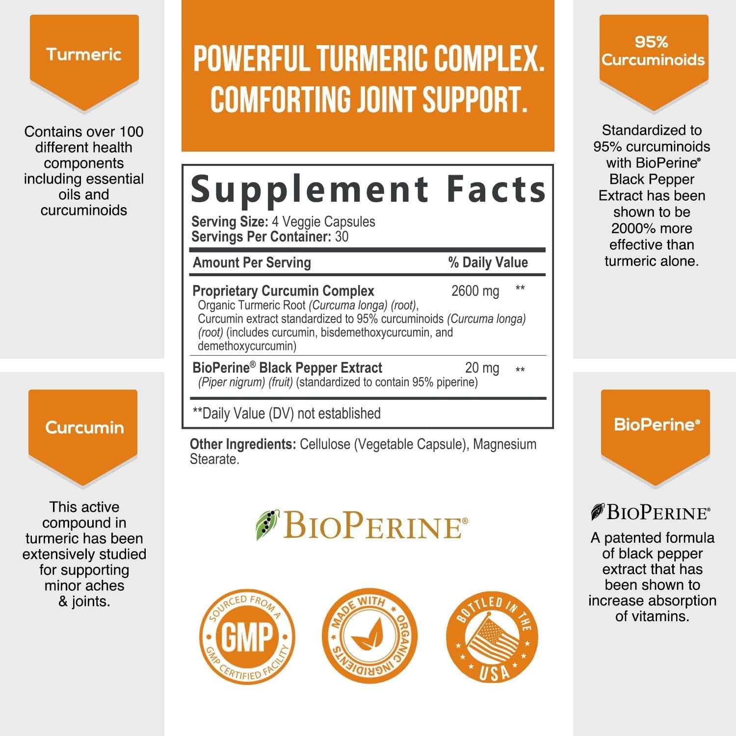 ULTRA POTENT TUMERIC SUPPLEMENT: Each serving delivers 2600mg of turmeric curcumin, standardized to 95% curcuminoids; These tumeric capsules provide maximum strength for supporting joint health and overall wellness