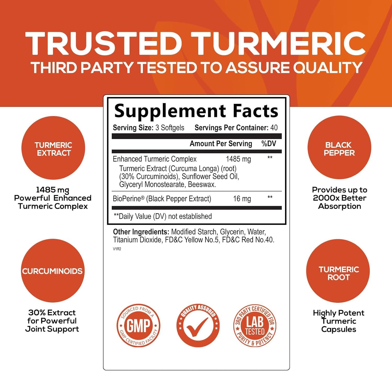 Turmeric Curcumin with BioPerine 95% Standardized Curcuminoids 1500mg – Black Pepper Extract for Max Absorption, Nature’s Joint Support Supplement, Herbal Turmeric Pills, Vegan Non-GMO – 120 Capsules