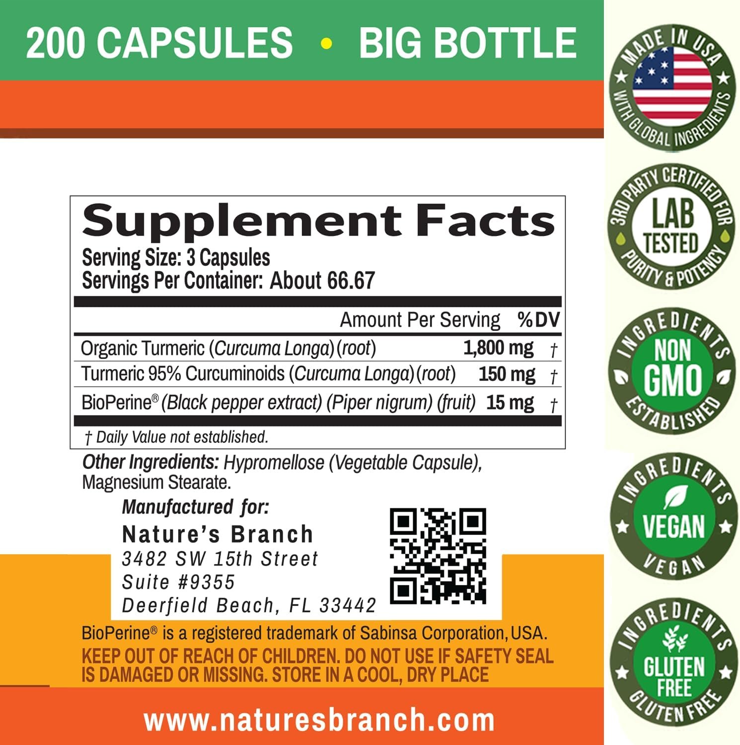MADE IN THE USA WITH ORGANIC INGREDIENTS: Nature’s Branch turmeric supplements contain organic turmeric along with curcumin and BioPerine. Made in a GMP facility and third party tested for quality, potency and purity. Completely free from artificial colors for an vegan, non-GMO anti-oxidant turmeric experience. Our highest grade turmeric pills for men and women