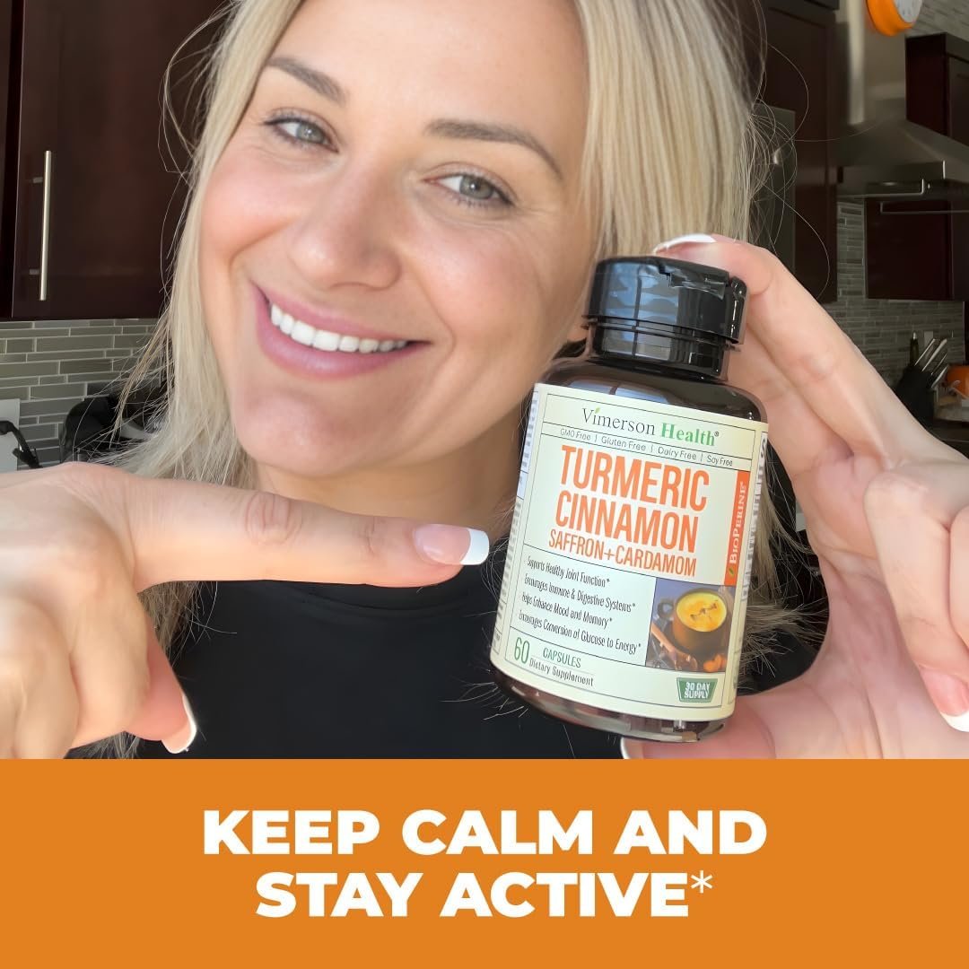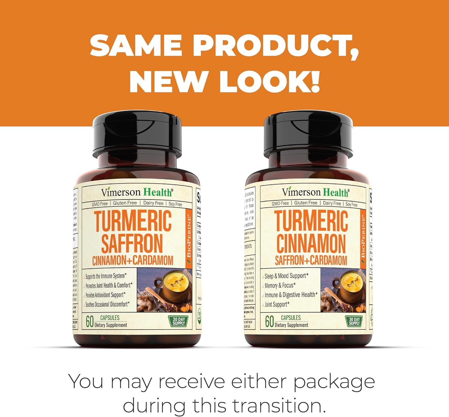 PREMIUM TURMERIC SUPPLEMENT YOU CAN TRUST. Vimerson Health Turmeric Cinnamon Saffron is made in the USA in a cGMP-Certified & USP-Verified Facility with Globally-Sourced ingredients. Non-GMO. Free from Gluten, Dairy, Sugar & Soy.*