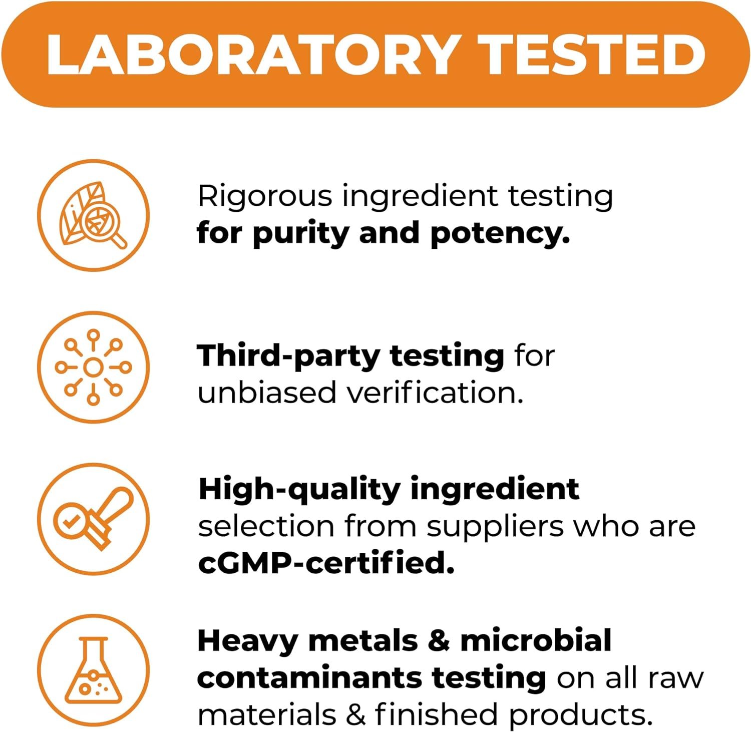 We conduct thorough quality tests during production to ensure each product’s purity and potency. Ingredients are chosen only from suppliers adhering to Stringent Industry Standards and cGMP.
