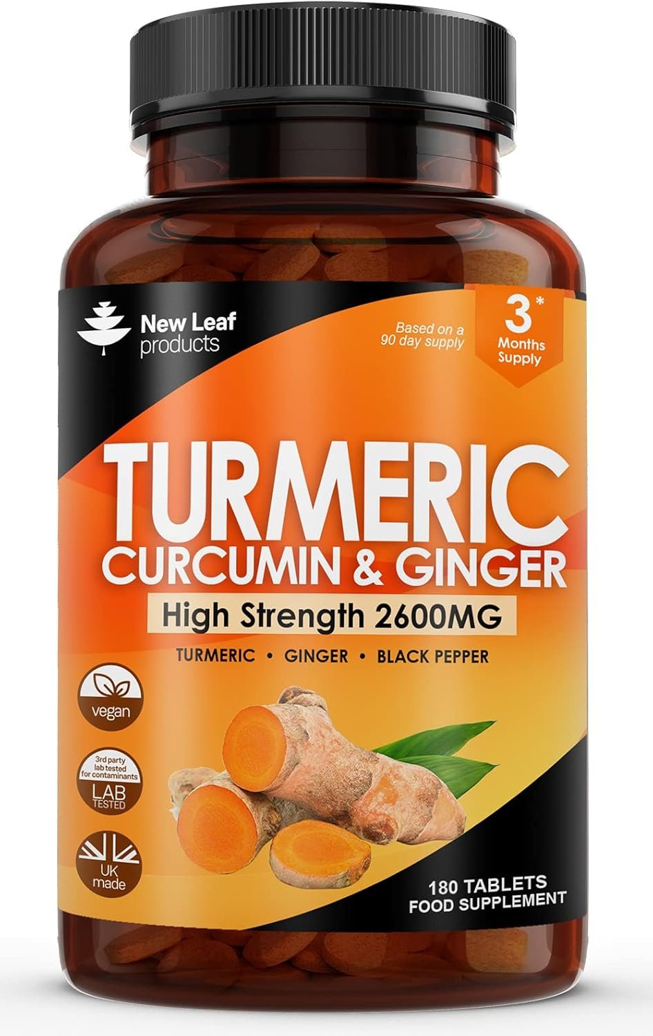 Turmeric Tablets 2600mg with Black Pepper & Ginger – 95% Curcumin Extract 180 and (3 Month) High Strength Active Supplements Not Capsules,by New Leaf