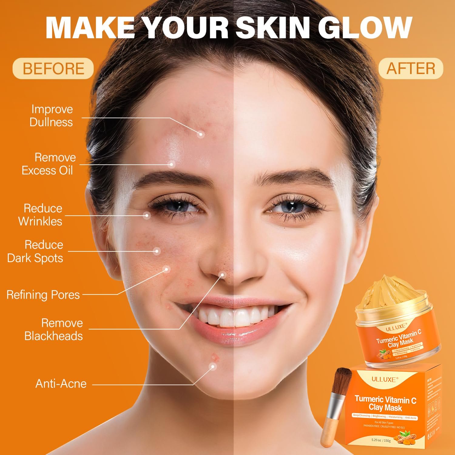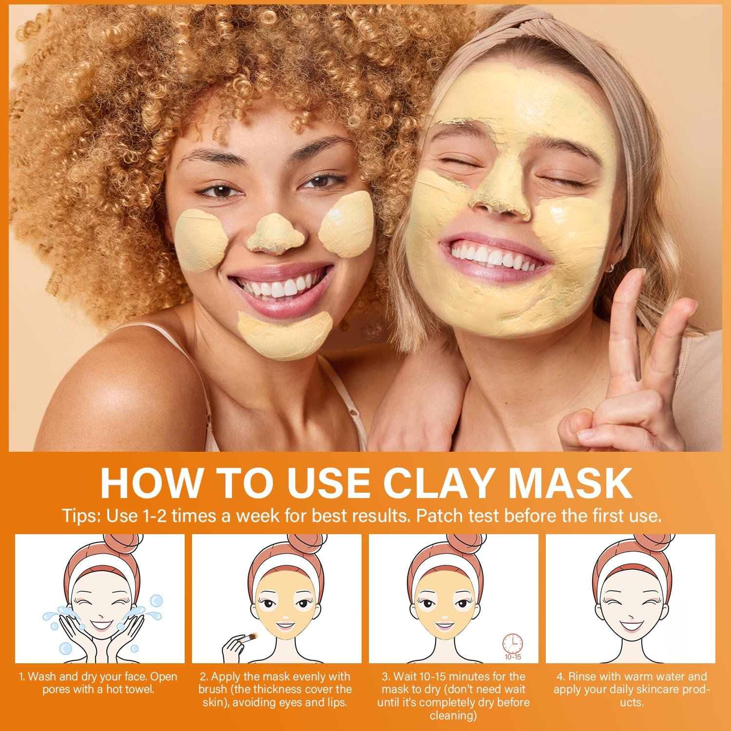 【Easy to Use】Ulluxe turmeric vitamin c clay mask comes with a soft mask brush, making your application more convenient. Steps: After washing your face, apply the mask evenly to your face, avoiding eyes and lips. Wait 10-15 minutes to dry it, then wipe it and rinse thoroughly with water. After drying, use toner and your daily skin care products. We recommend using clay mask 1-2 times a week or according to your skin type needs.