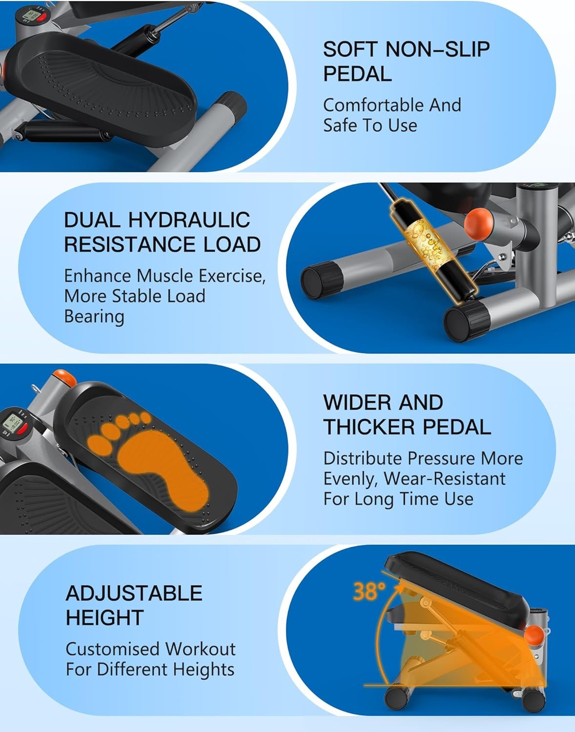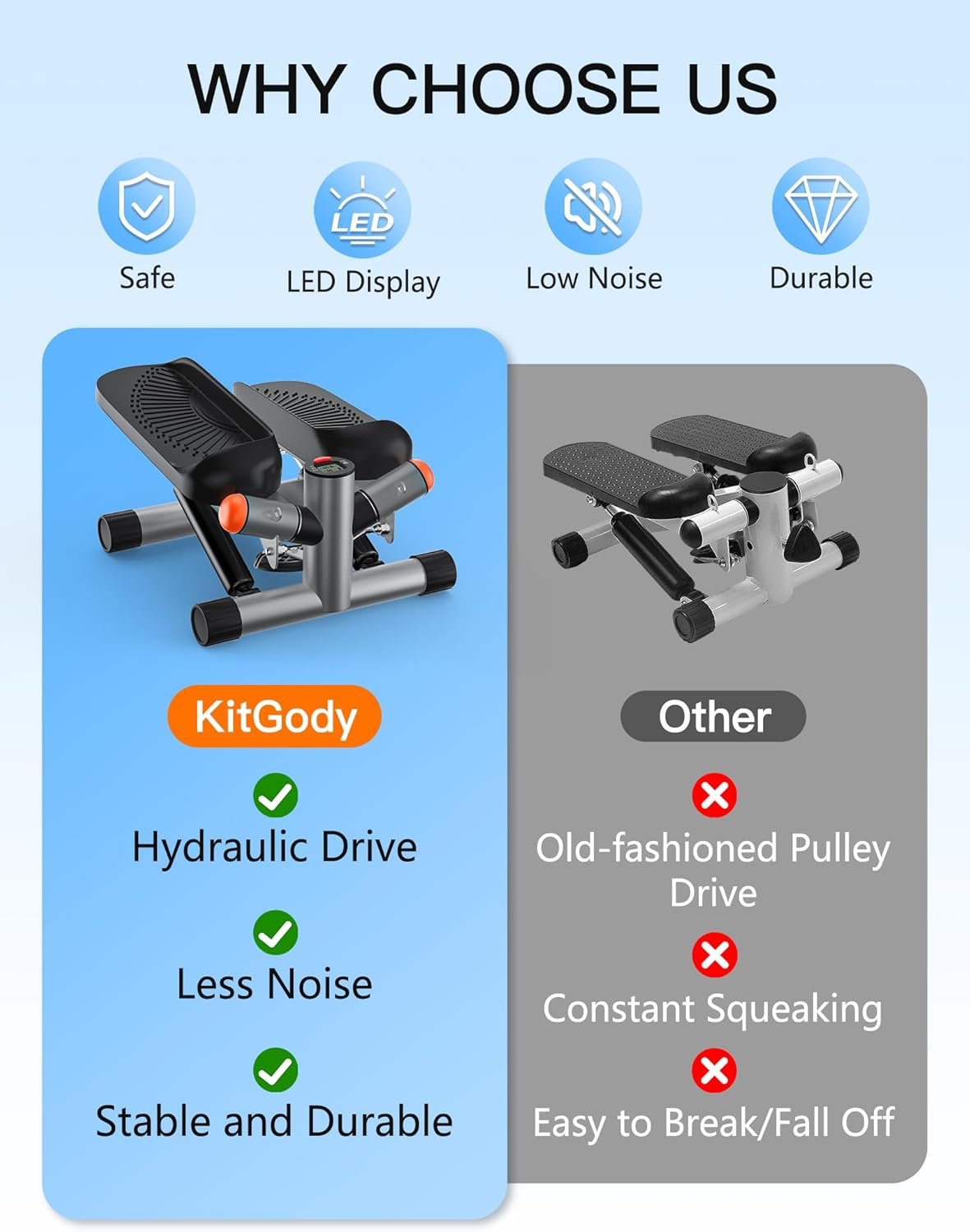 Stable and Safty: KitGody twist stepper for home is built with 2MM thick steel and advanced hydraulic system which provides balance and can withstand a weight of 300 lbs