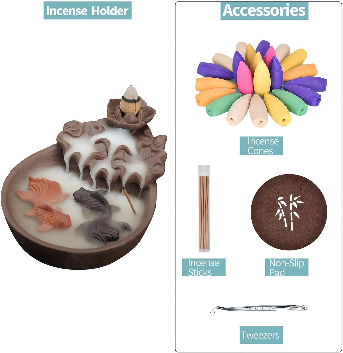Package Included: 1 x jessie backflow incense holder, 20 x incense cones, 1 x tweezers, 1 x pad, 1 set of incense sticks(Approx. 30).