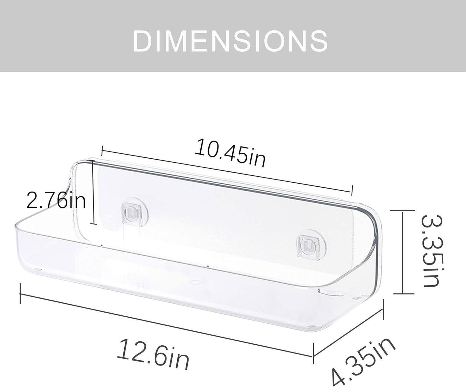 Material: Premium PlasticColor: ClearDimension: [Shower Basket] 12.6”W x 4.35”D x 3.35”H, [Soap Dish ] 4.73”W x 3.78”D x 3.15”H