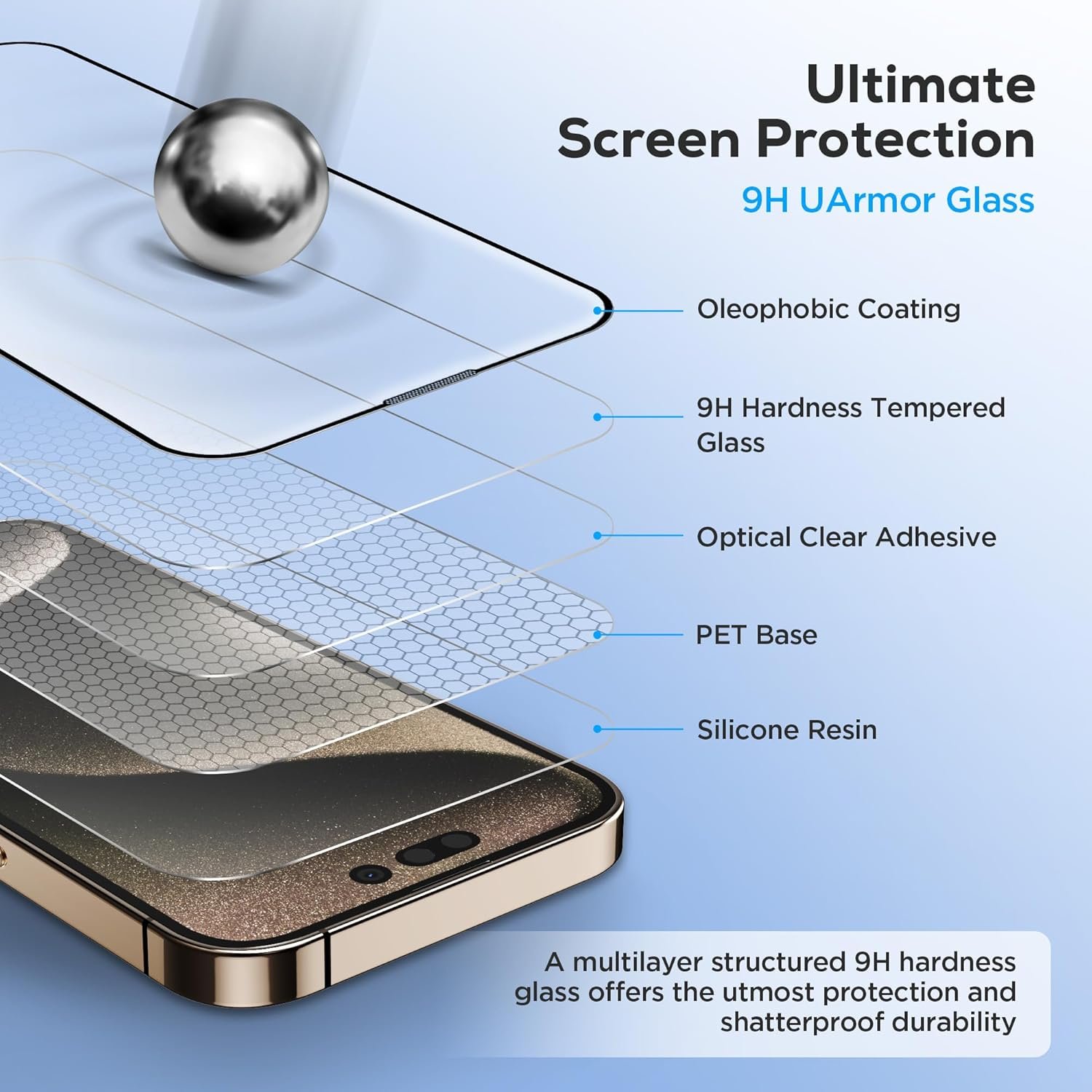 [Ultimate Screen Protection: 9H UARMOR Glass] The UARMOR Glass, featuring a multilayer structure with 9H hardness tempered glass, provides the highest level of protection and shatterproof durability for your iPhone. It safeguards your device from daily impacts, drops, and scratches, ensuring that your iPhone always remains safe.