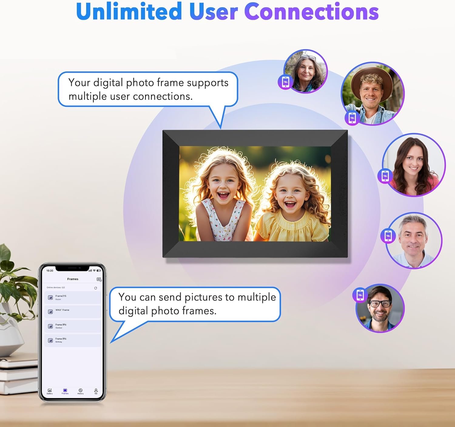 With over a decade of experience in the digital picture frame industry,WONNIE has built a reputation for excellence.Our products are highly regarded and widely sold across multiple countries.Seamlessly connect your smartphone or computer to effortlessly upload and share pictures in stunning clarity. Through your support,WONNIE can craft a product that not only fulfills your requirements but also surpasses your expectations.