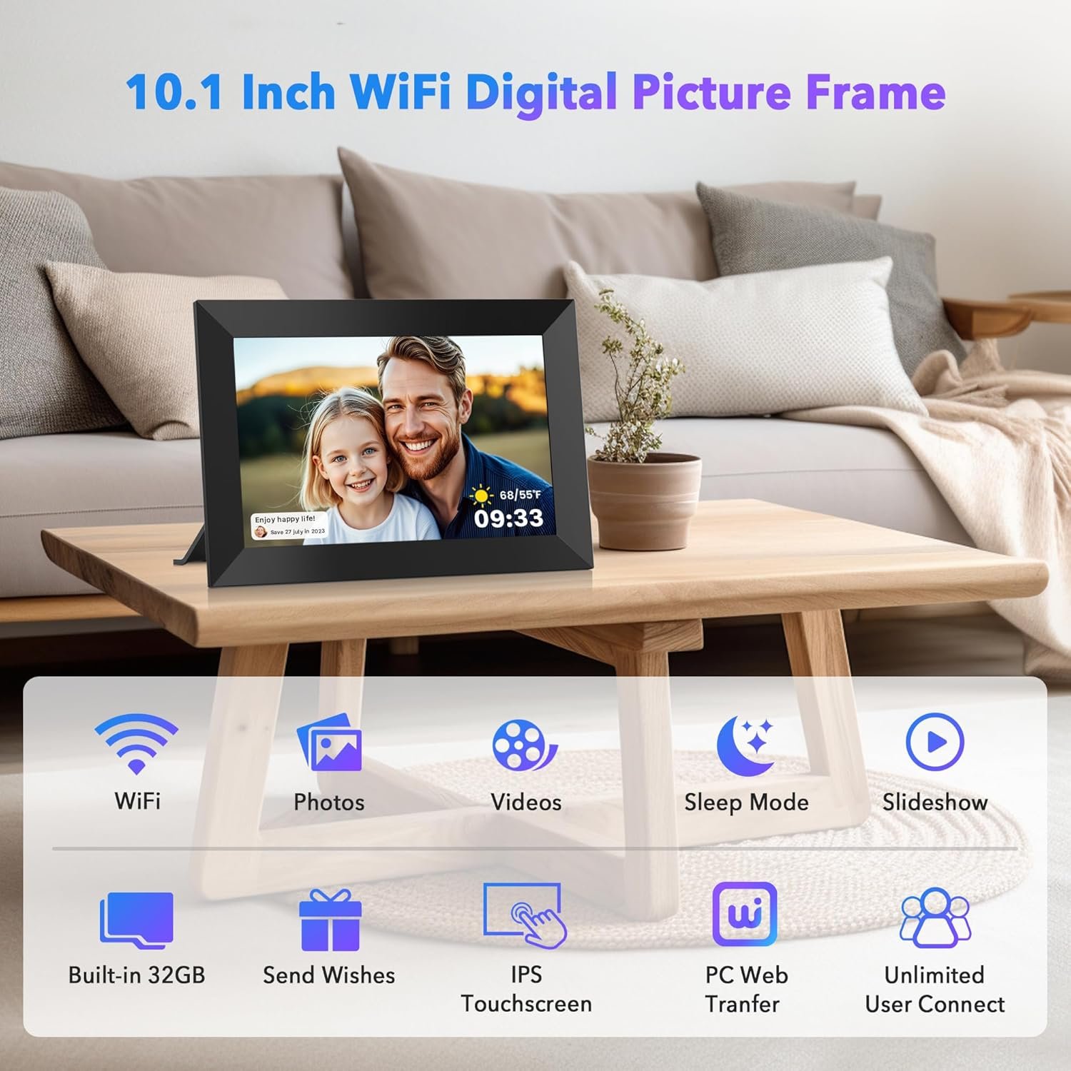 Auto-rotate & Large Storage Space:Our smart technology easily detects the digital frame’s orientation to ensure your photos are displayed correctly. This digital photo frame wifi has built-in 32GB memory and supports 32GB Mirco SD card. You can store more than 100,000 photos (the average photo size is about 300KB). At the same time, you can also transfer photos through the SD card to meet your different needs.