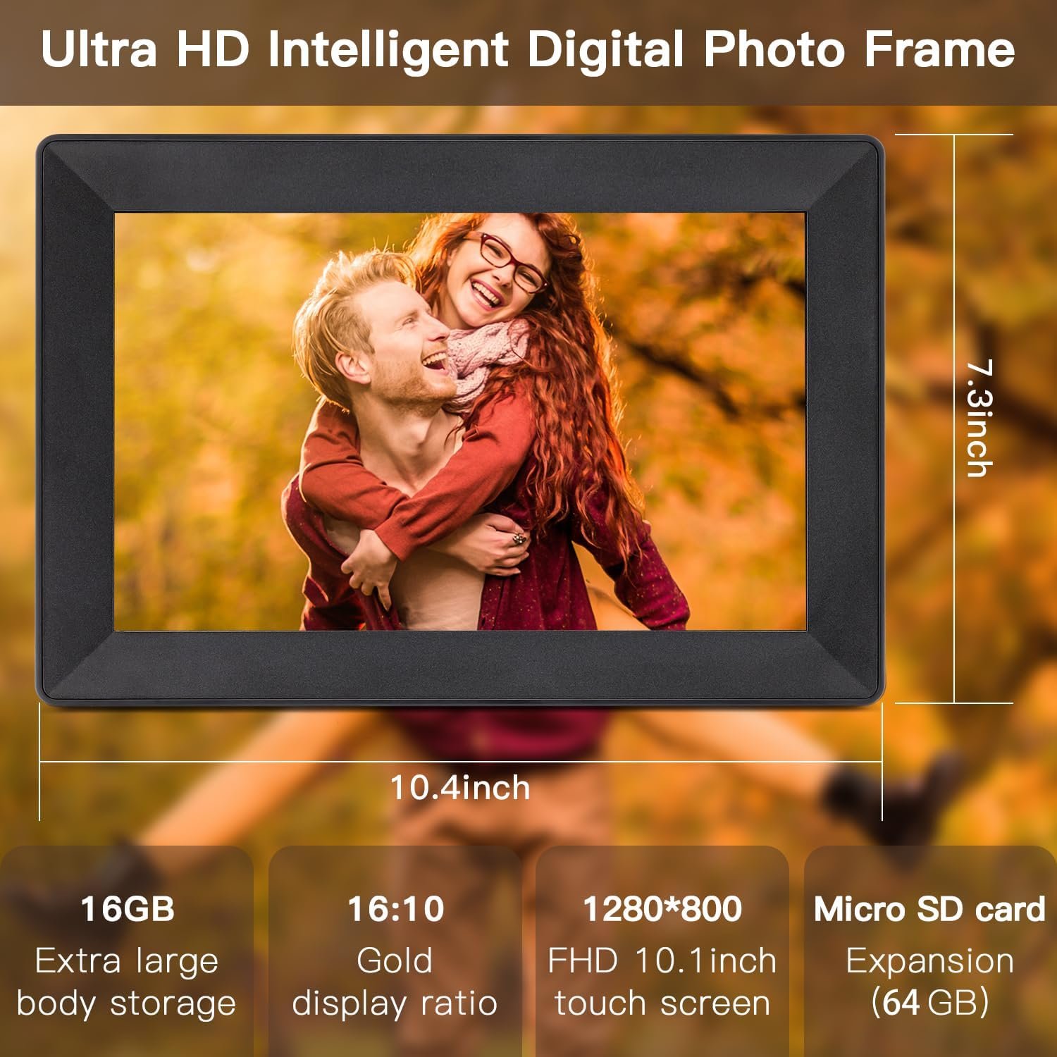 More practical functions:Digital Photo Frame has a 10.1-inch touch screen, 16GB storage space, gravity sensing device, simple design, easy operation and clearer visual effects,Large memory are enough for a family’s daily use.
