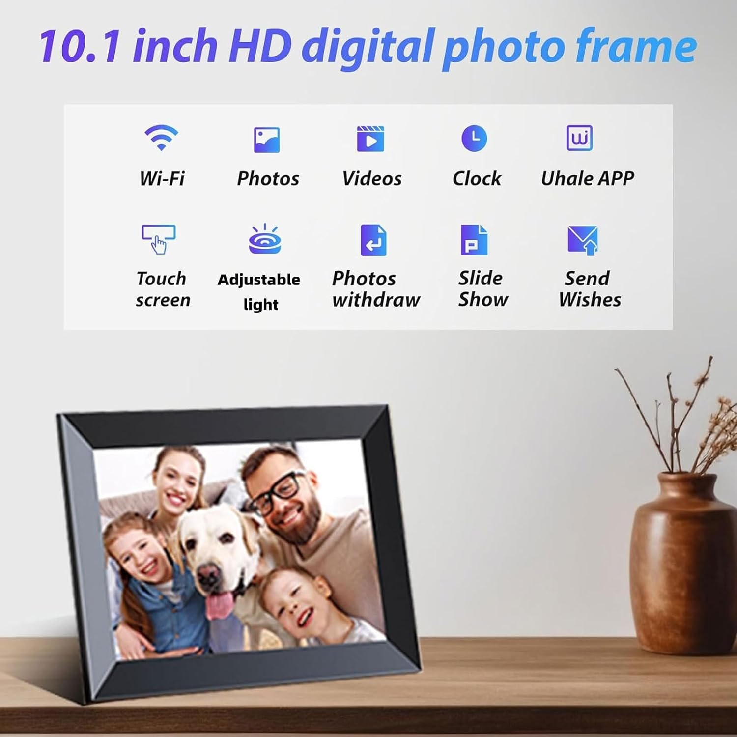 ππ πππππππ & πππππ ππππππ: The digital picture frame has a 10-inch high-definition 1280*800 HD IPS touch screen, perfect for displaying photos and videos. It is equipped with a USB-C port, an SD card slot (Supports up to 32GB), and 16GB of internal storage, providing a convenient way to store numerous treasured memories