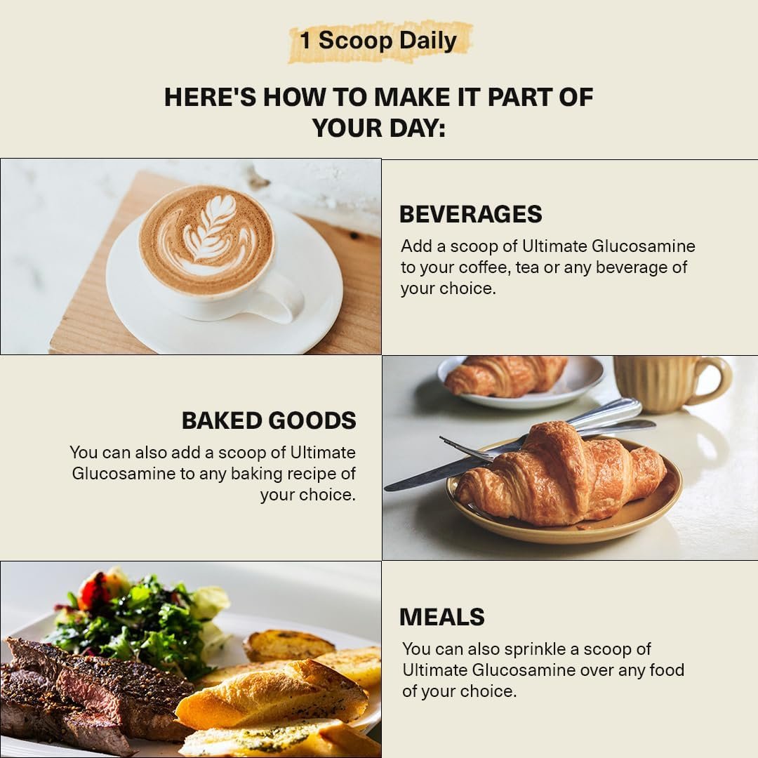 Convenient Daily Dose: Our simple once-a-day scoop makes integrating Ultimate Glucosamine into your routine effortless. This easy-to-swallow powder can be seamlessly added to hot or cold beverages, sprinkled over food, or used in baking, ensuring a hassle- free experience.