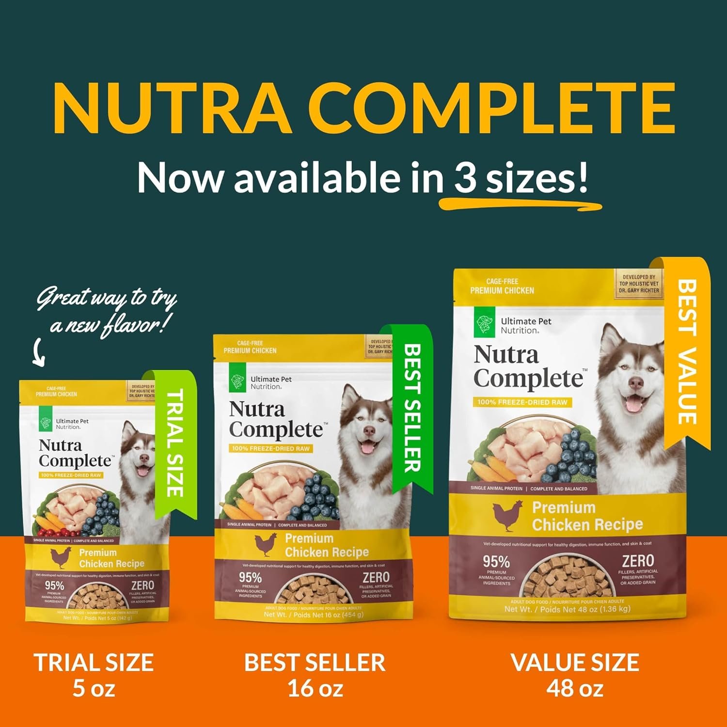 HIGH QUALITY CHICKEN – Premium, cage-free chicken and organs make up 95% of Nutra Complete. Our chicken is 100% freeze-dried raw, so your dog gets easily digestible protein from every bite.*