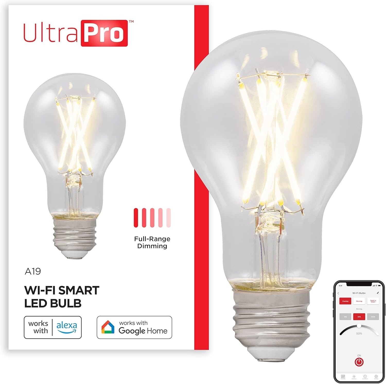 Make the bright choice in smart lighting with the UltraPro™ Wi-Fi Smart LED Bulb. Connect the smart bulb to a 2.4GHz Wi-Fi network to control and schedule lamps, wall and accent lighting, or other fixtures. By supporting dual- and tri-band routers, the bulb is ideal for the latest home Wi-Fi equipment. The easy-to-use UltraPro app with hassle-free pairing options is available on the Apple App Store and on Google Play. The A19 bulb with E26 base fits standard lights rated for 60W. It also offers full-range dimmability for every time or task. Brightness is adjusted from 0-100% with a simple slider or common levels using convenient preset buttons. To fully automate your life, connected lights are controlled by scheduled settings, weather changes, location and countdowns. Custom commands support operation around the clock while timer presets allow lighting control with ease. Smart is simple with the UltraPro Wi-Fi Smart LED Bulb.