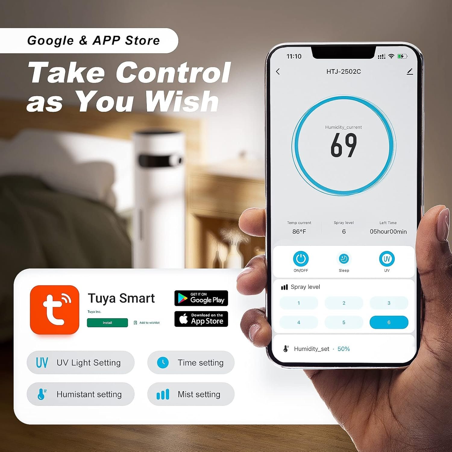 4. Customize humidity between 50%-90%.( The ideal range for indoor humidity is 45%-60%.)