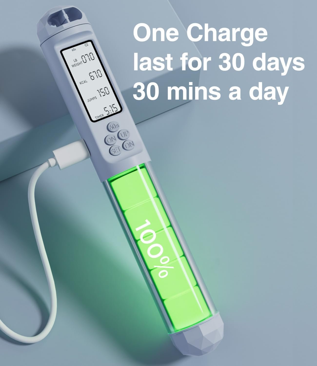 𝐄𝐱𝐭𝐞𝐧𝐝𝐞𝐝 𝐒𝐭𝐚𝐧𝐝𝐛𝐲 𝐓𝐢𝐦𝐞: With a single charge, the jump rope can be used for up to 30 days, with 30 minutes of daily usage