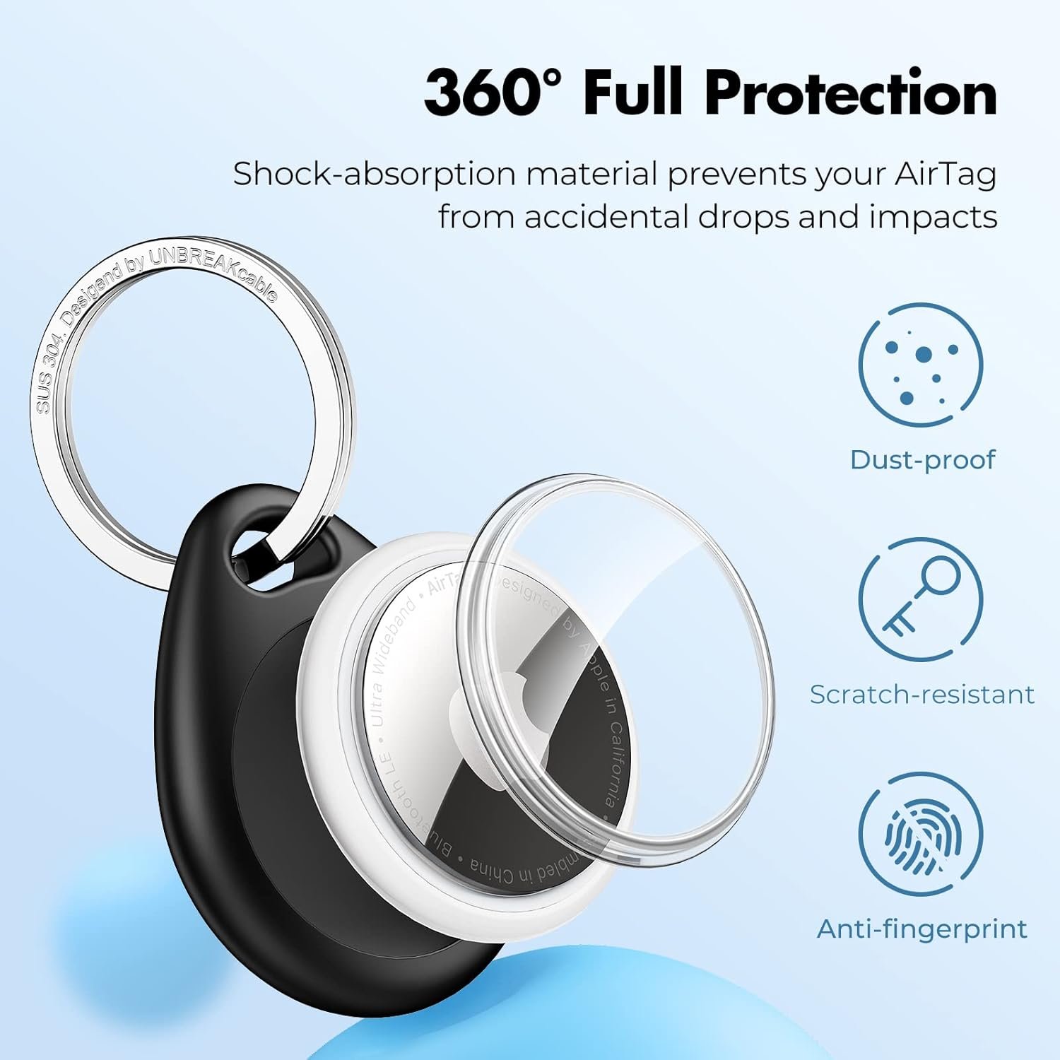 UNBREAKcable AirTag keyring case-Include 4 Airtag 360 ° Protective cases, with 4 SUS 304 Stainless steel metal rings!
