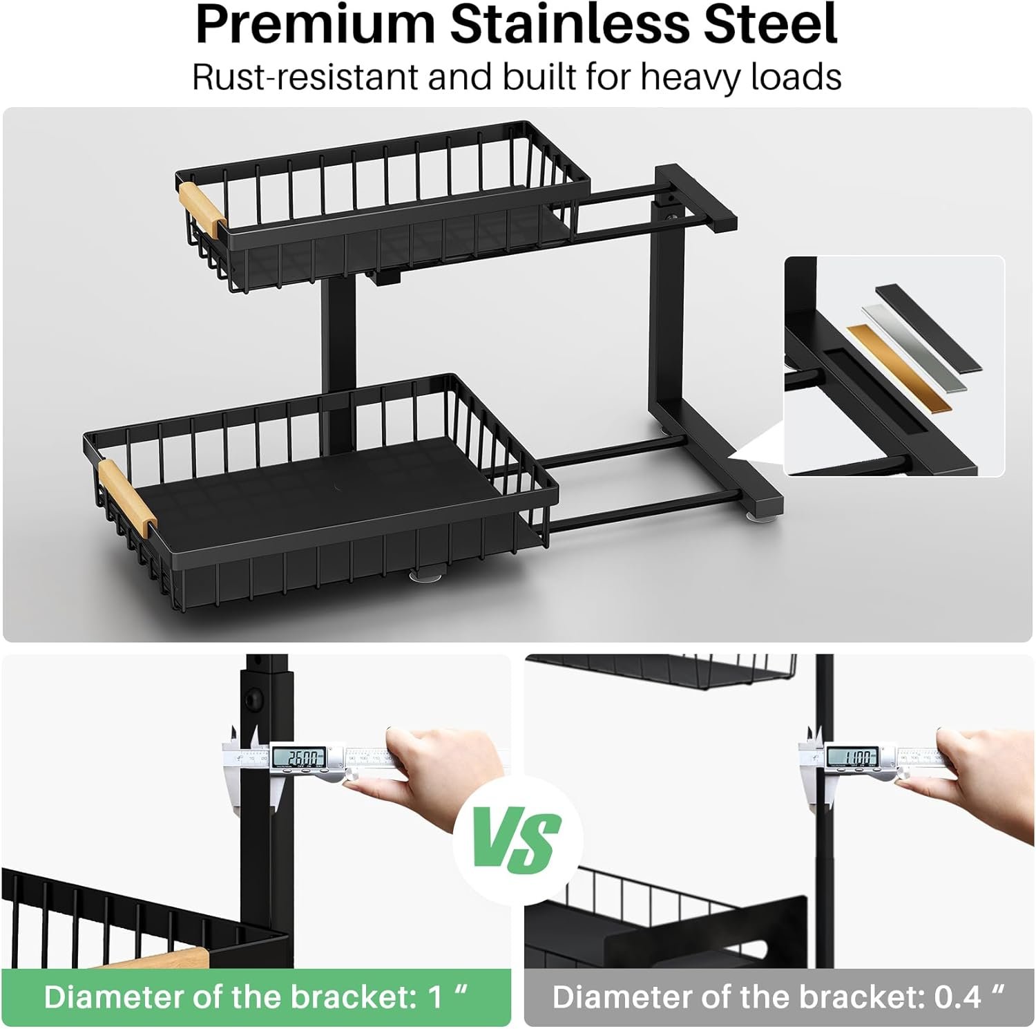 【Unique Slide Rail Design】With a unique round rail design, that adds handy wooden handles, the sliding drawers on the under sink organizer are easier to pull out without hitting the plumbing than others, and glide smoothly and quietly.