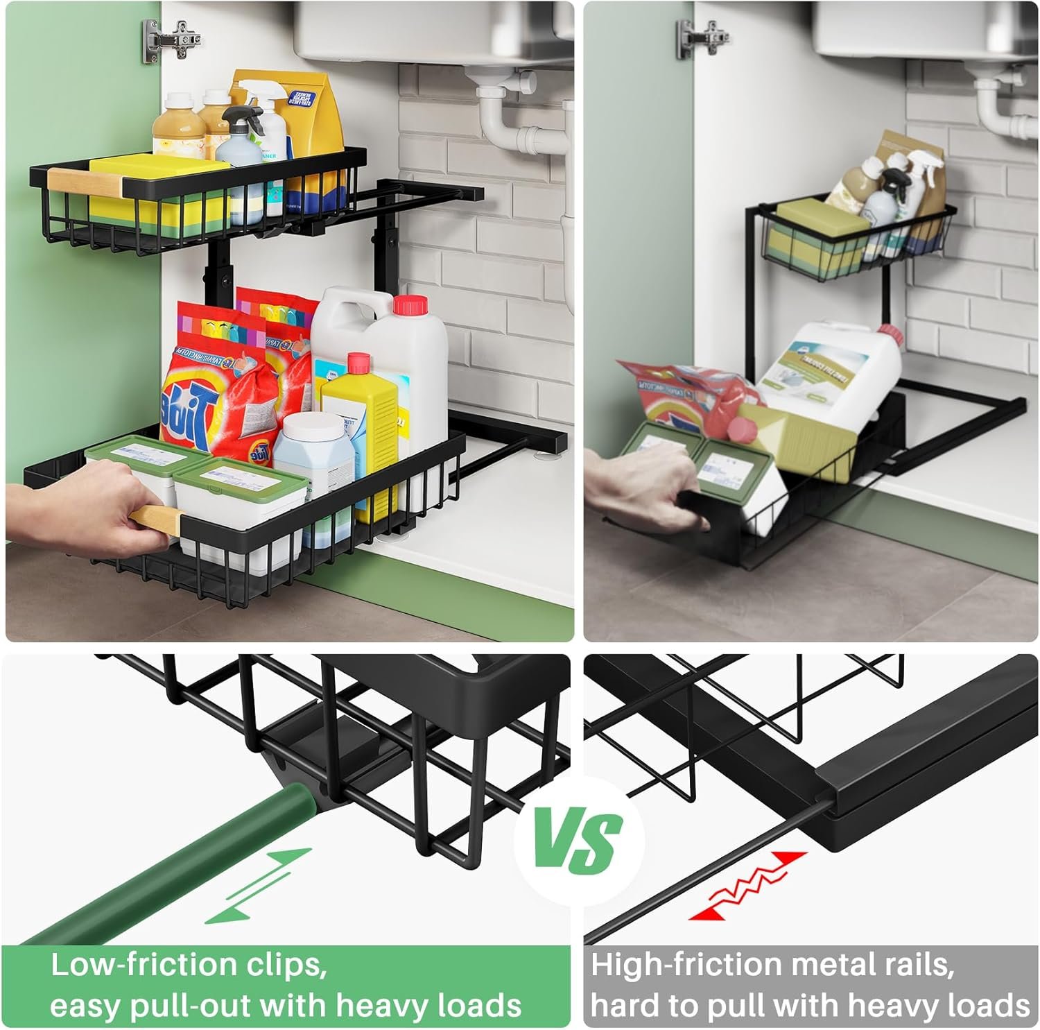 【2 Tier Sliding Baskets】The under sink organizers and storage are designed with a unique design that both the upper and lower baskets can be pulled out, allowing you to access the items that are stored under the sink.