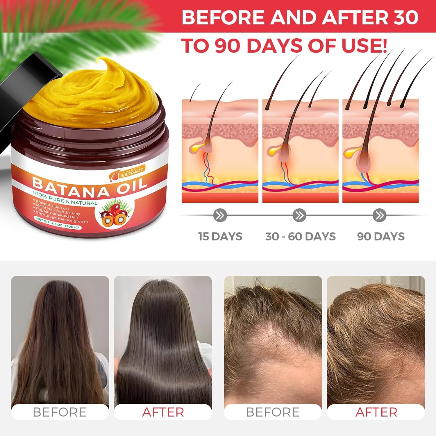 Herbal Formula for Men, Women & All Hair Types: Think of this 100 percent pure batana oil as a superfood for your scalp; It can help with genetically influenced hair loss or anyone who’s just unhappy with their hair’s appearance and texture