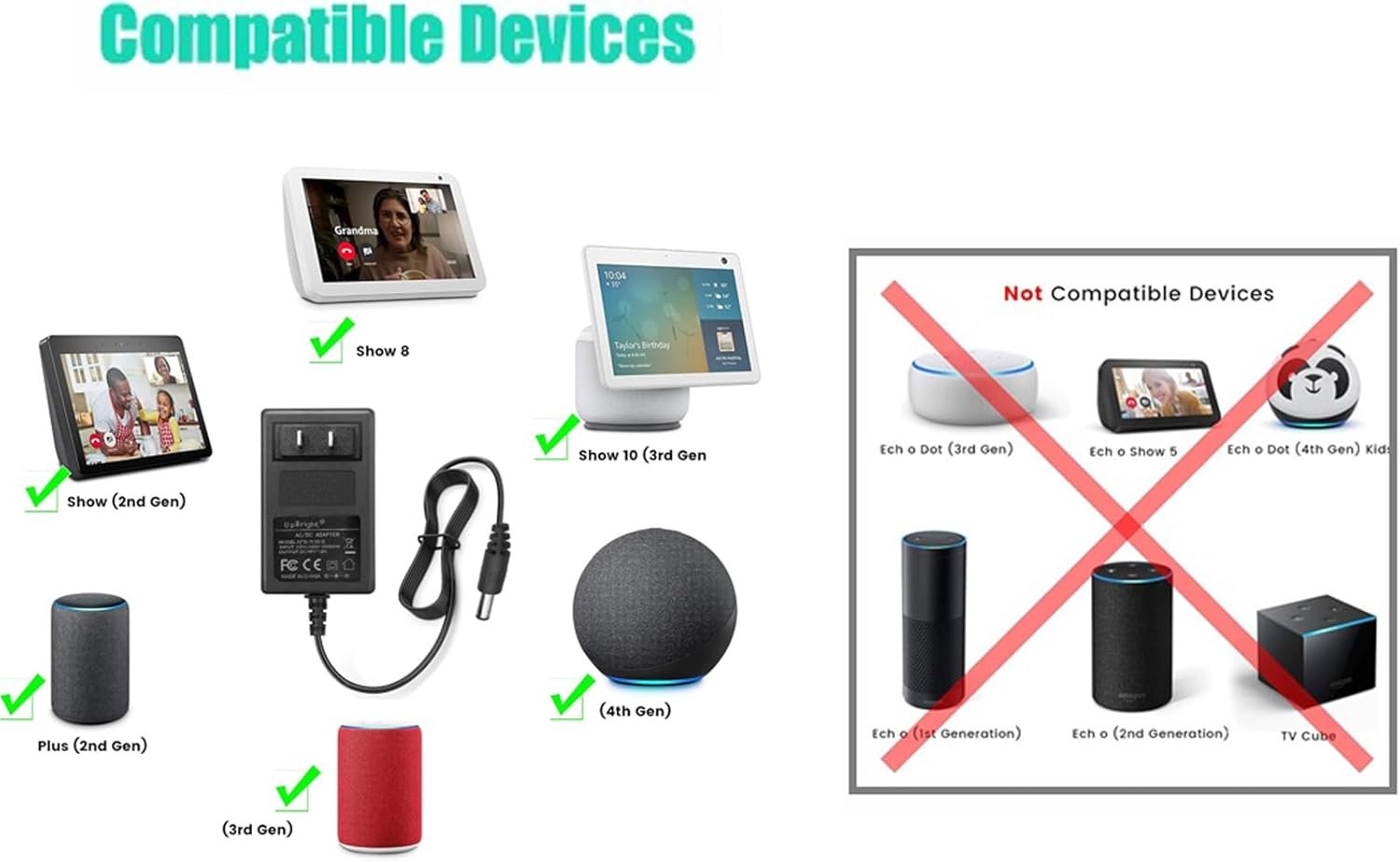 Compatible with: Amazon 30W power adapter for the Amazon Echo (3rd Gen), Echo Plus (2nd gen) and Echo Show (2nd gen); Amazon Echo Show 8 8” HD Smart Display with Alexa