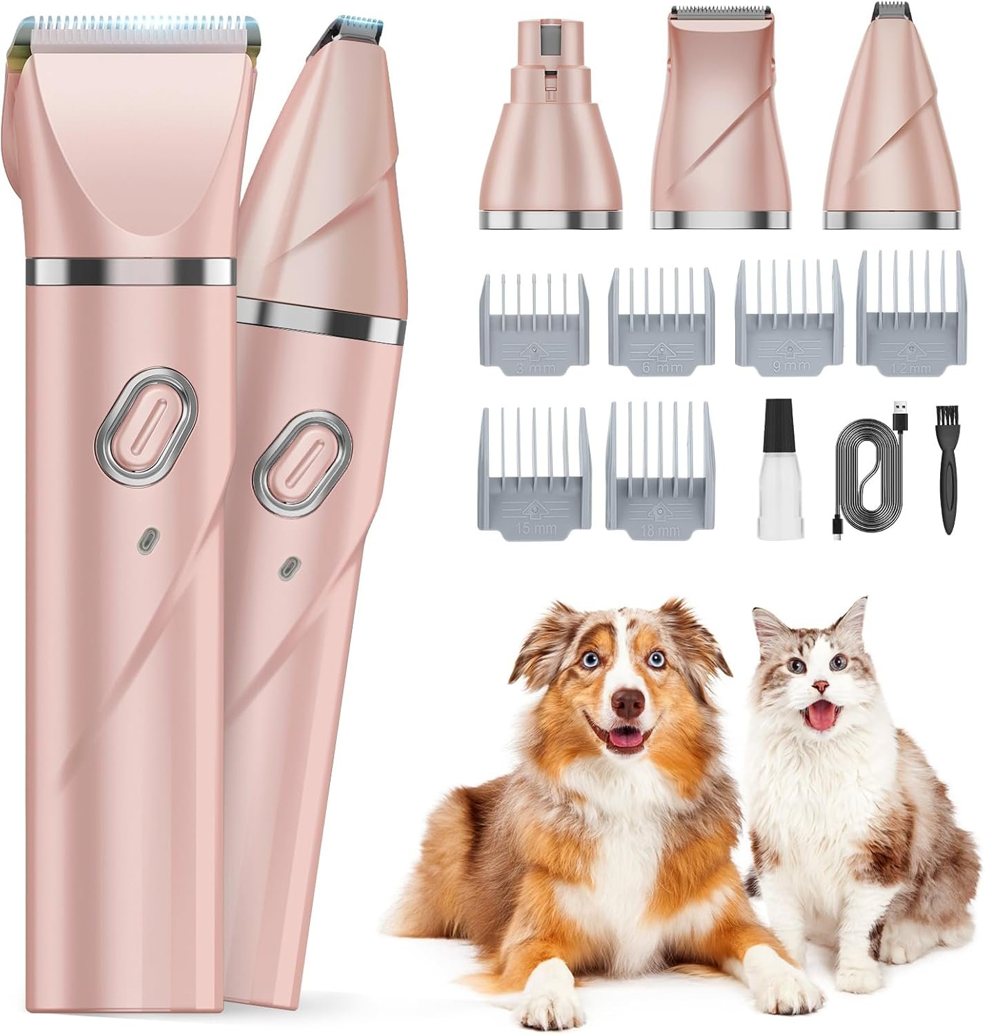 4 IN 1 PERFECT PET GROOMING KIT – Our dog grooming clipper with 4 replaceable trimmer heads and 6 guided combs(3 mm/6 mm/9 mm/12 mm/15 mm/18 mm). Can precisely and effectively trim hair from body, face, ears, nails, paws and rump of dogs, cats and other animals. Make your pet’s hair will be perfectly trimmed to your desired length, comfortable for your pet’s scalp. And give your pets a safe, relaxing and excellent grooming experience