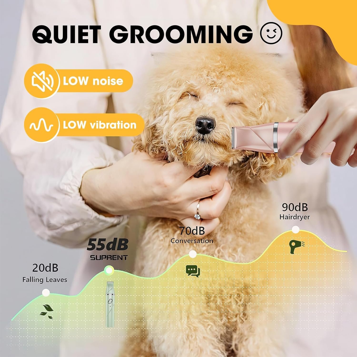 SAFE & EFFECTIVE – This dog grooming clipper has rounded R-shaped blades to protect your pet’s skin from scratches. It has plenty of power with two different speeds(6000 &6500 RPM). Our dog grooming supplies feature a superior motor and whisper-quiet technology, low noise≤ 50dB wont scare your dog. It makes your dogs feel easy and no afraid of cutting hair any more