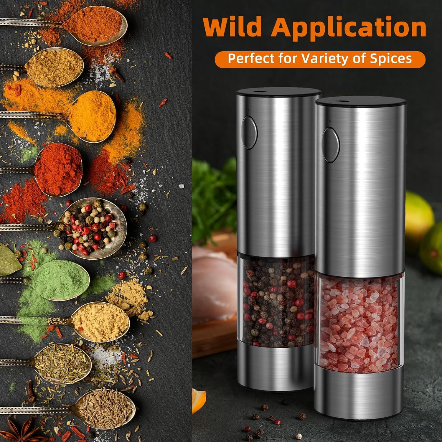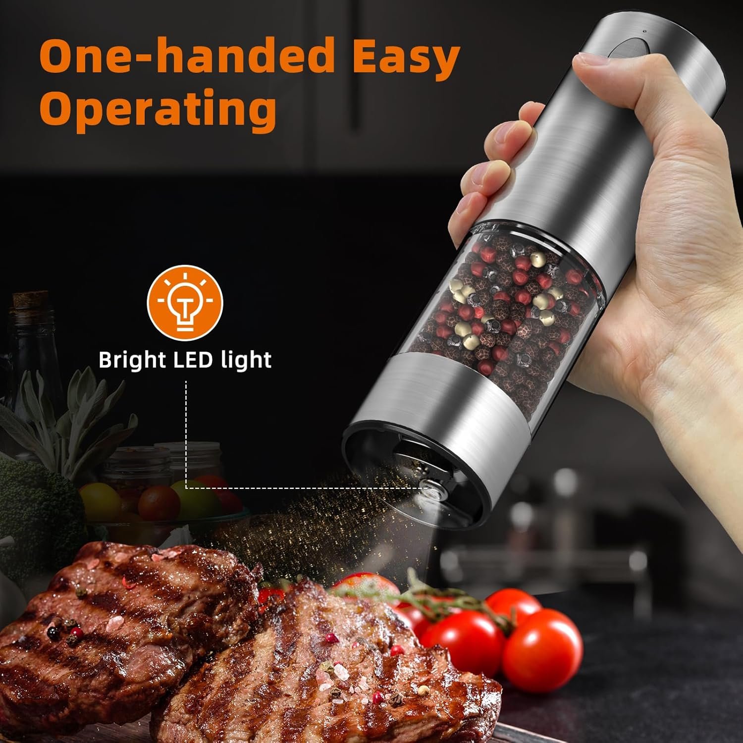 Automatic spice grinding: Easy One-Handed Operation, Grinding is just a matter of pressing a button! There’s also a soft LED light on while working so that seasonings can be seen clearly after being ground. This electric salt and pepper grinder with LED light is friendly to children, the elders and those who have arthritis, especially people busy meal preparations.