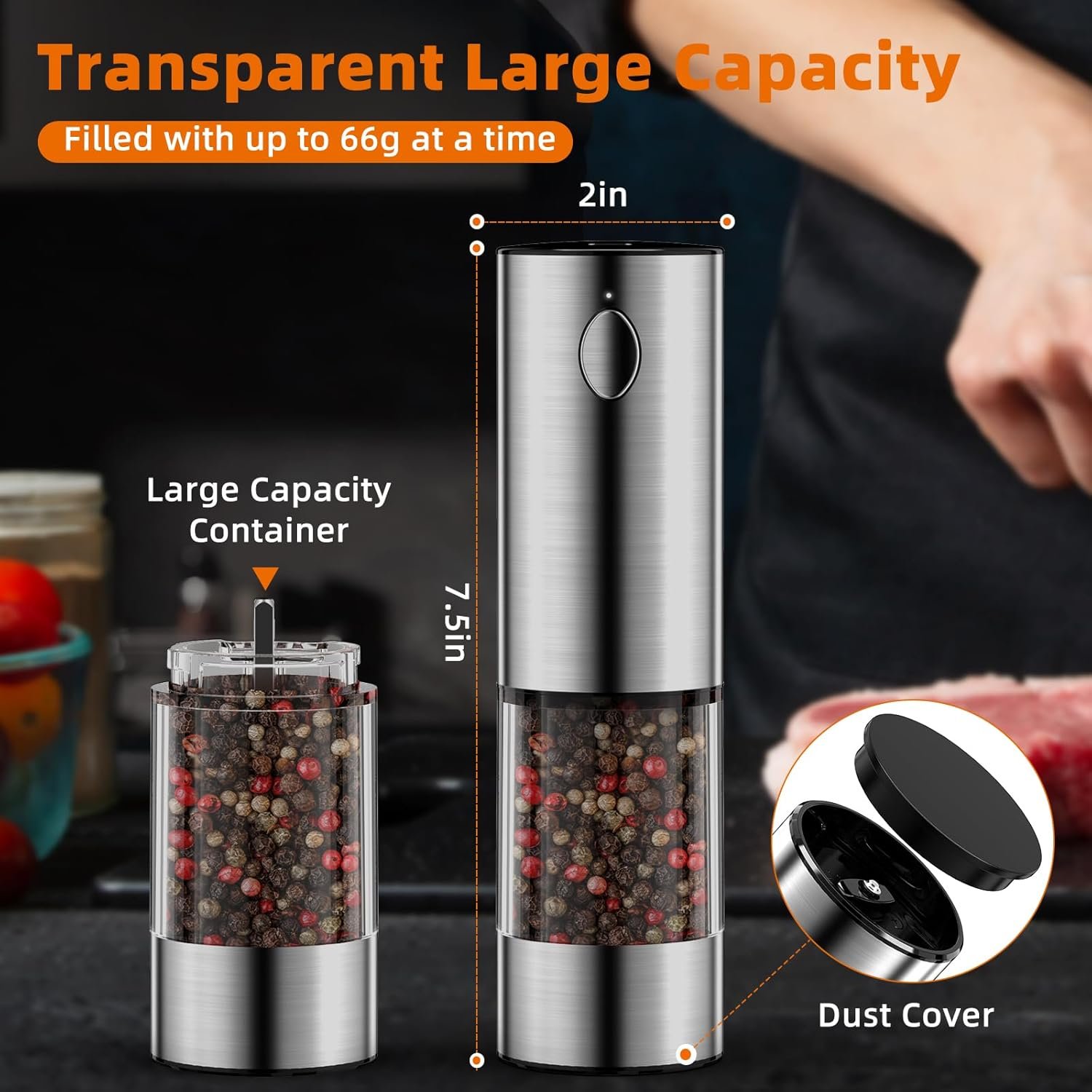 Extra-Large Capacity: Adopt food-grade ABS material to build the spice container, which is large enough to hold 60g of spices . A transparent lid increases visibility to distinguish the spices or check how much remains. A cover for the pepper grinder prevents dust and stops the spice powder from making a mess.