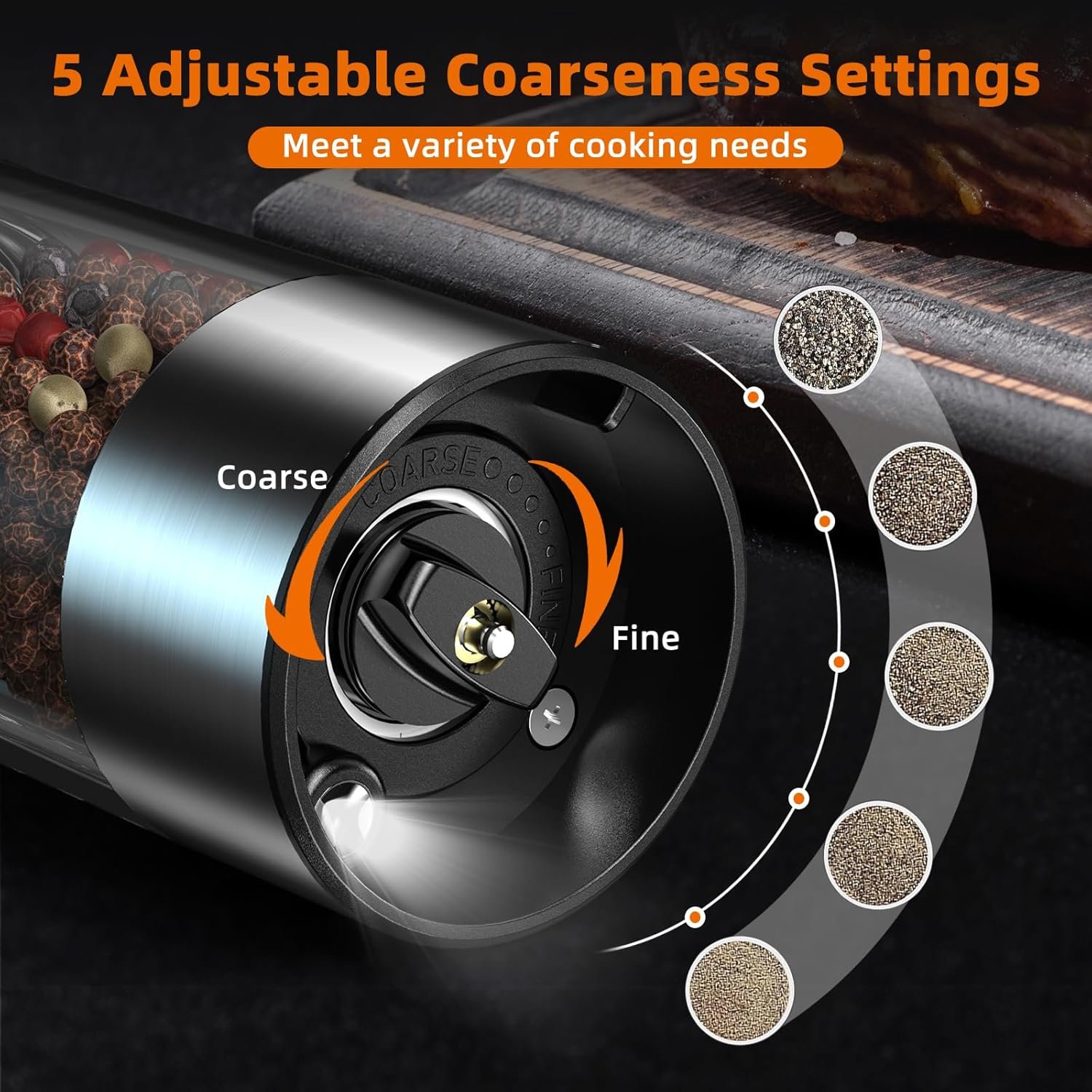 5-Level Adjustable Coarseness: Choose the coarseness of grains according to your preference. Rotate the knob on the bottom clockwise for a finer grind or anticlockwise for a coarse grind. Utilize the durable and safe stainless steel drive shaft to bring spices into wanted granular sizes.