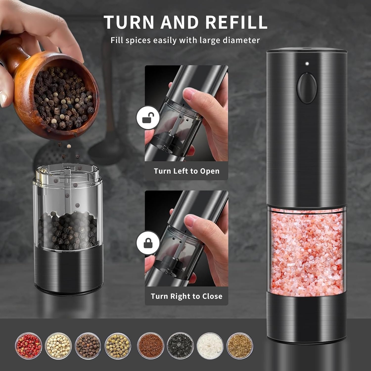 Constructed with premium-grade stainless steel, our electric salt and pepper grinder set is not only durable but also exudes a sleek and stylish look. It’s a perfect addition to any kitchen or dining table, enhancing your culinary experience.