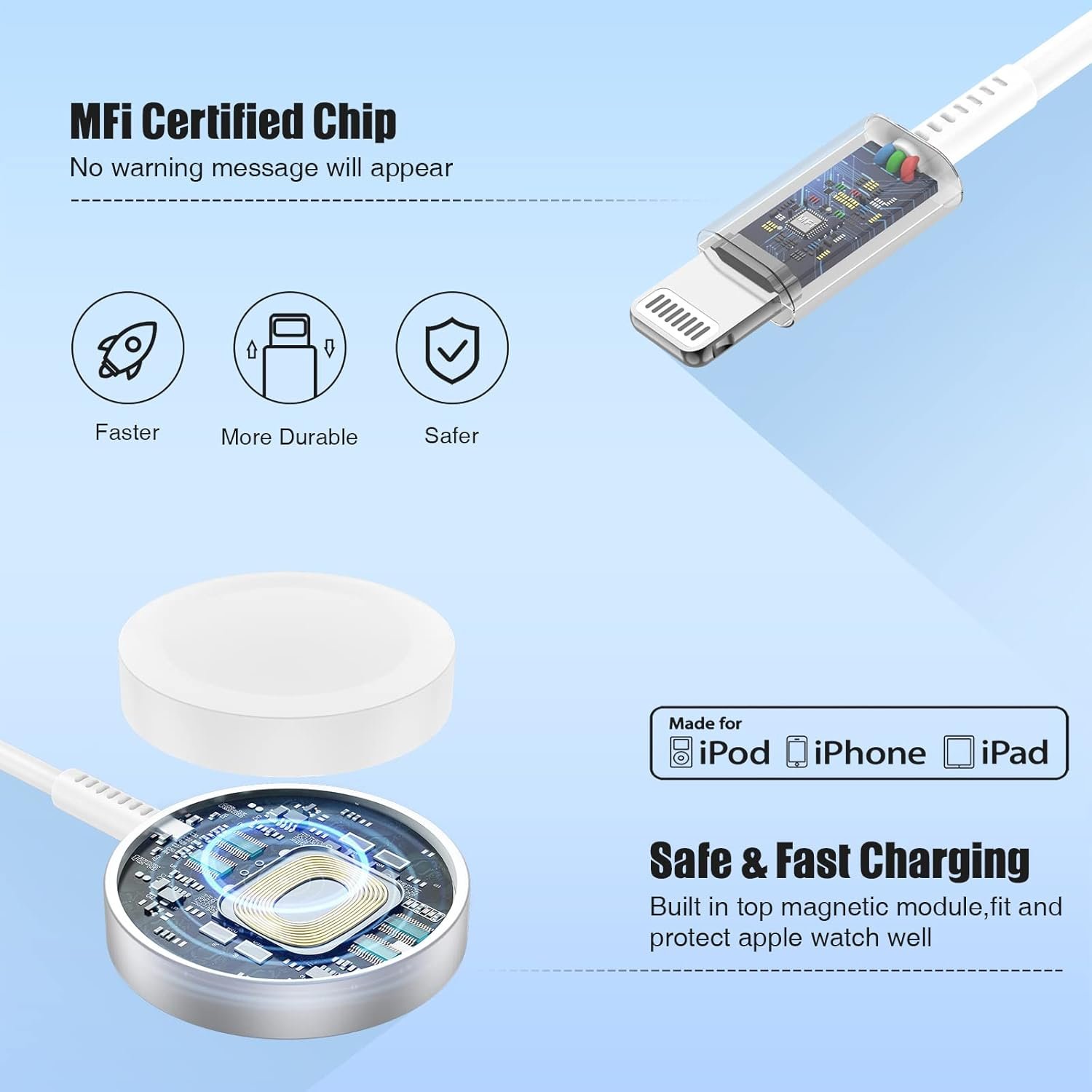【Magnet Design】The lighting cable built-in MFi certification, this cord supports stable charging of iPhone. Strong magnetic adsorption, just hold the connector close to the back of the apple watch, and the iWatch Magnetic will automatically pull it into place to steadily charge your Apple Watch. With the original MFi chip and integrated magnetic technology.