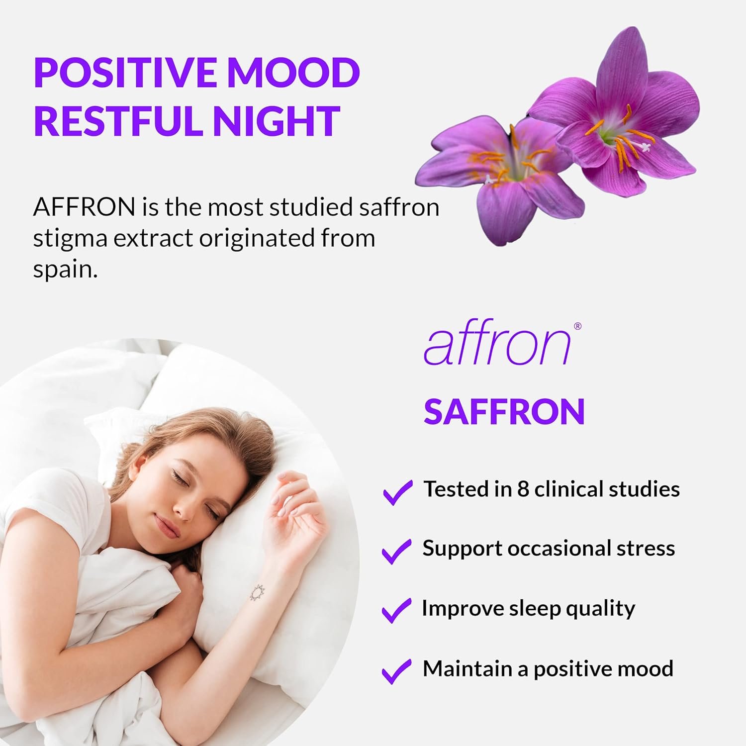 MORE RESTFUL NIGHT: AFFRON is a fast-acting, non-habit forming saffron stigma extract. AFFRON has been tested in 3 clinical studies and shown to reduce the number of awakenings during night, increase rest quality, enhance focus and alertness upon waking up. AFFRON helps adults and teenagers maintain a positive mood and alleviate stress, frustration and tension