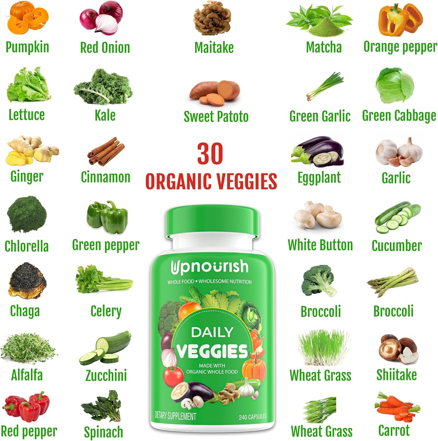 Organic Greens and Reds Veggie Pills: UpNourish Daily fruit and veggies supplement contains 31 organic super fruits and 31 organic vegetables, suppling essential phytonutrients including whole food vitamins, minerals, antioxidant polyphenols and fiber