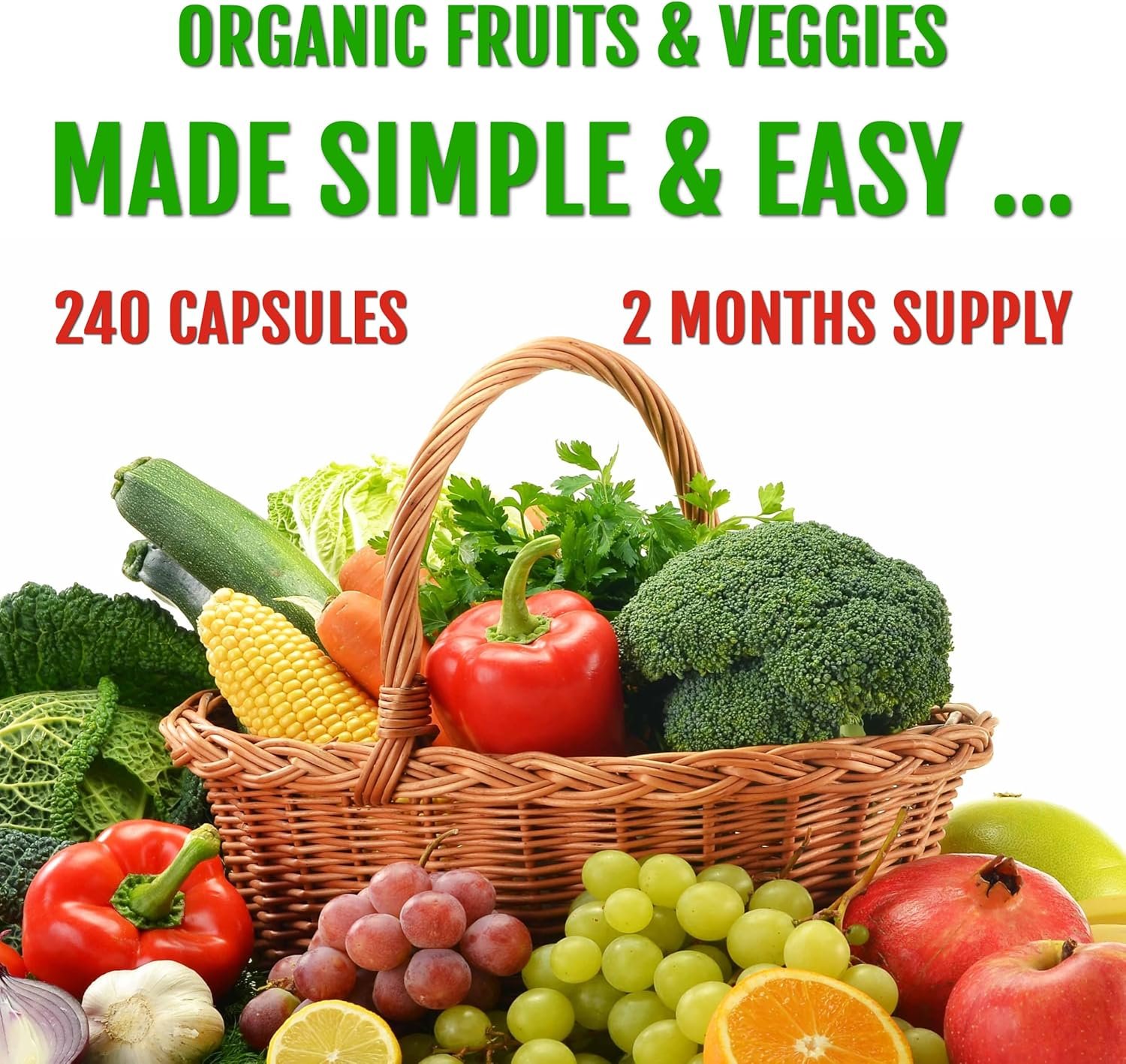 480 Super Fruits and Vegetable Capsules: Our product includes 240 organic fruits vegan capsules and 240 organic vegetable vegan capsules – a total of 480 red and green superfood capsules for 2 month supply. It is the most value added fruit vegetable supplement
