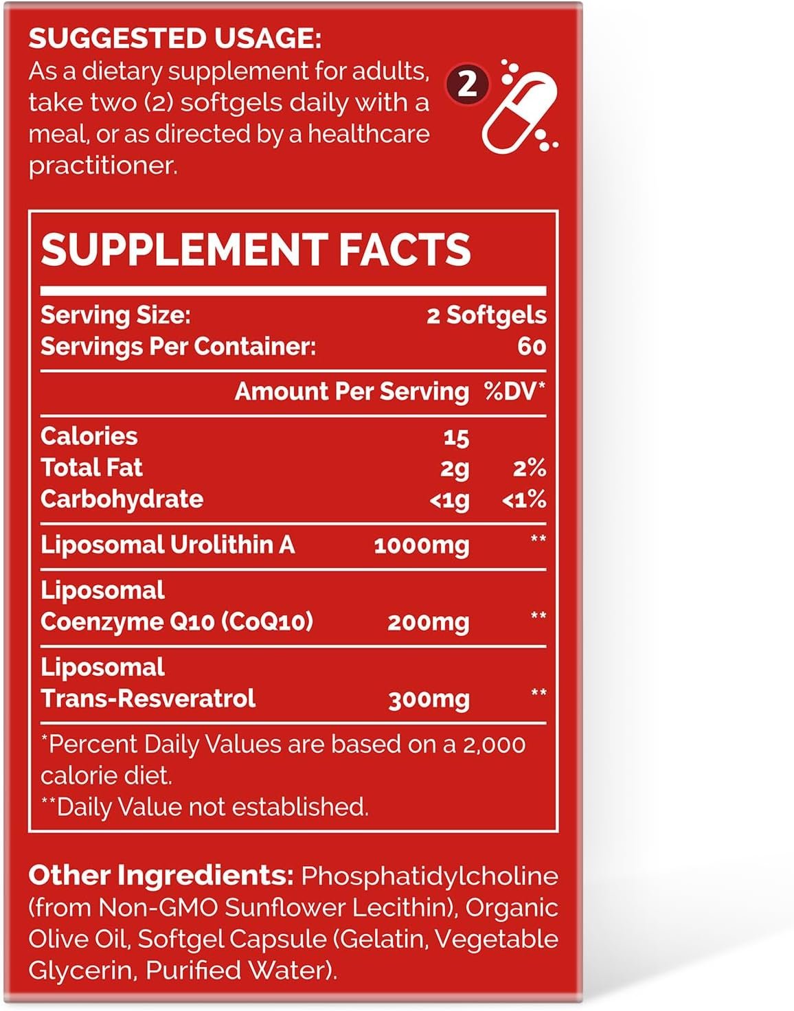 1000mg of Urolithin A, 300mg of trans-resveratrol, and 200mg of CoQ10 Per Serving