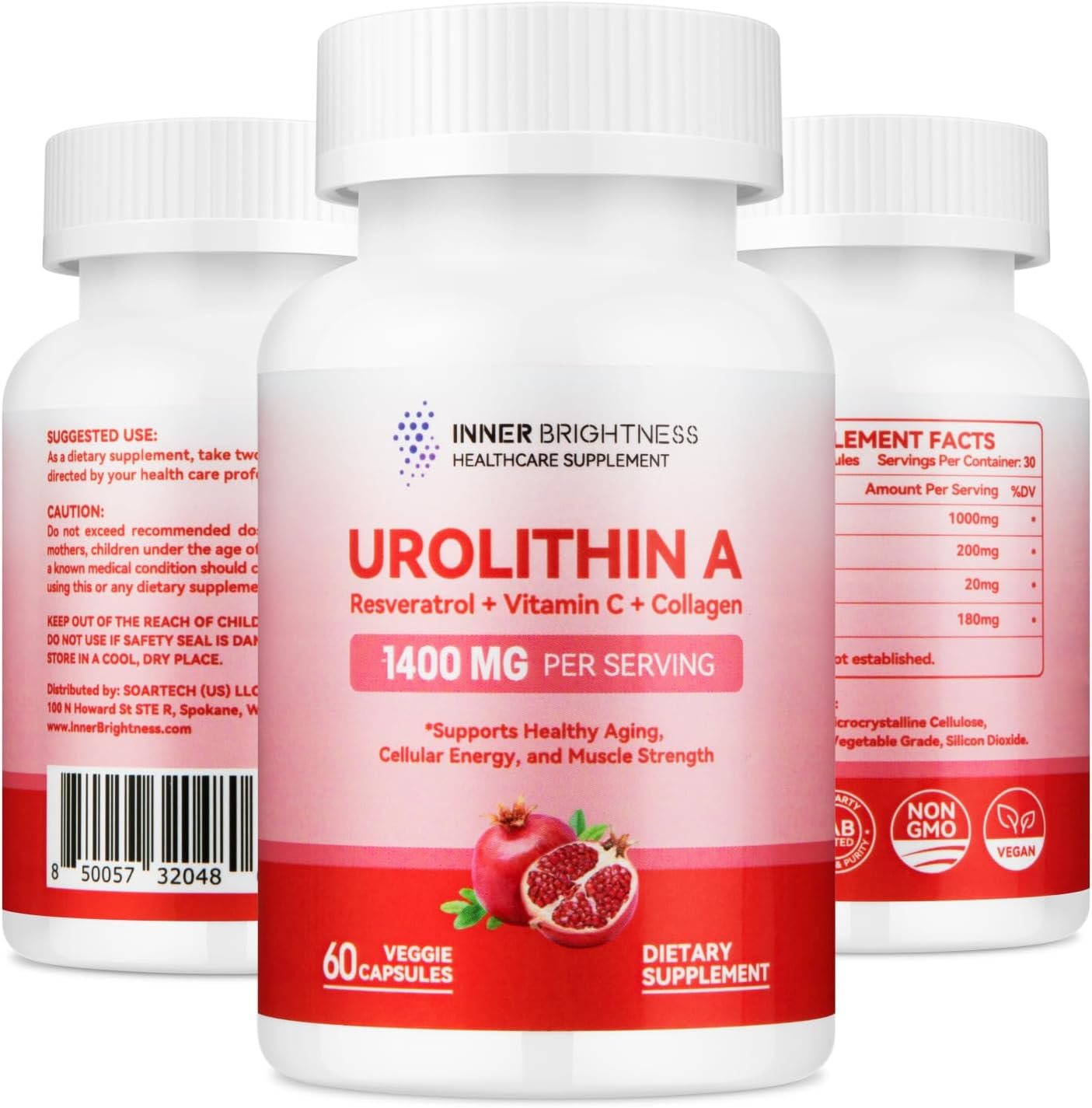 Support Cellular & Skin Health: Nurture your cells and skin from within with 1000mg of Urolithin A and 180mg collagen! This Urolithin A supplement ensures maximum absorption, promoting cellular renewal and enhancing skin elasticity and radiance.
