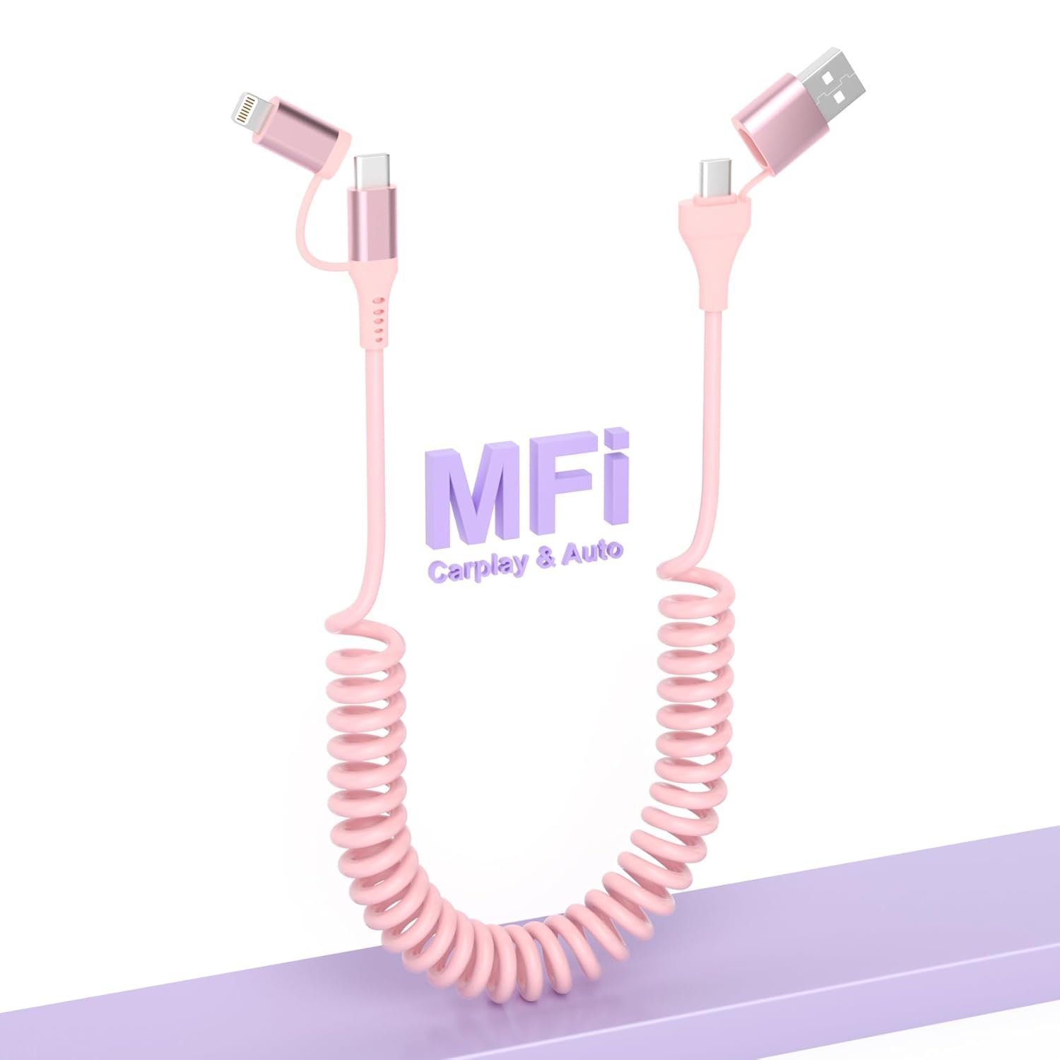 USB C and Lightning Cable 4 in 1 PD 60W/27W Fast Charging [MFi & Data Sync] Apple CarPlay & Android Auto Coiled Lightning Cable-Retractable iPhone Charger Cord for iPhone/Pad/Android/Laptop,Pink