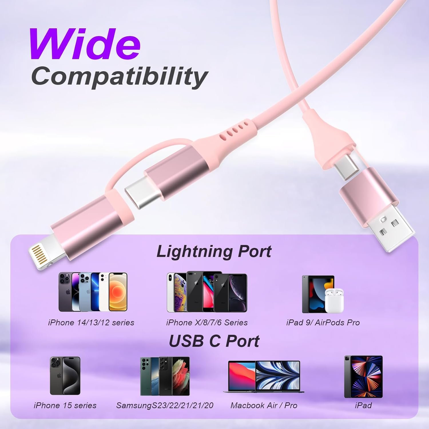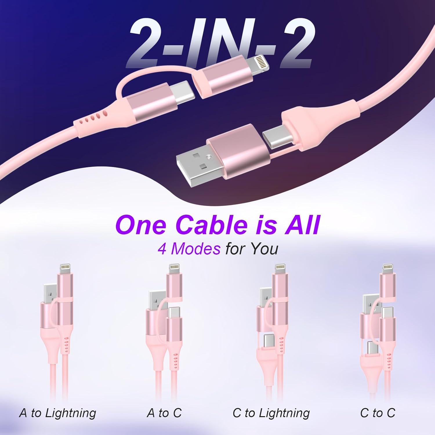 4-in-1 Charging Cables : Our design concept is to simplify your life. One multi charging cable equals four cables: USB A to C, USB A to Lightning, USB C to Lightning and USB C to USB C. No need to carry multiple cables for different devices when traveling