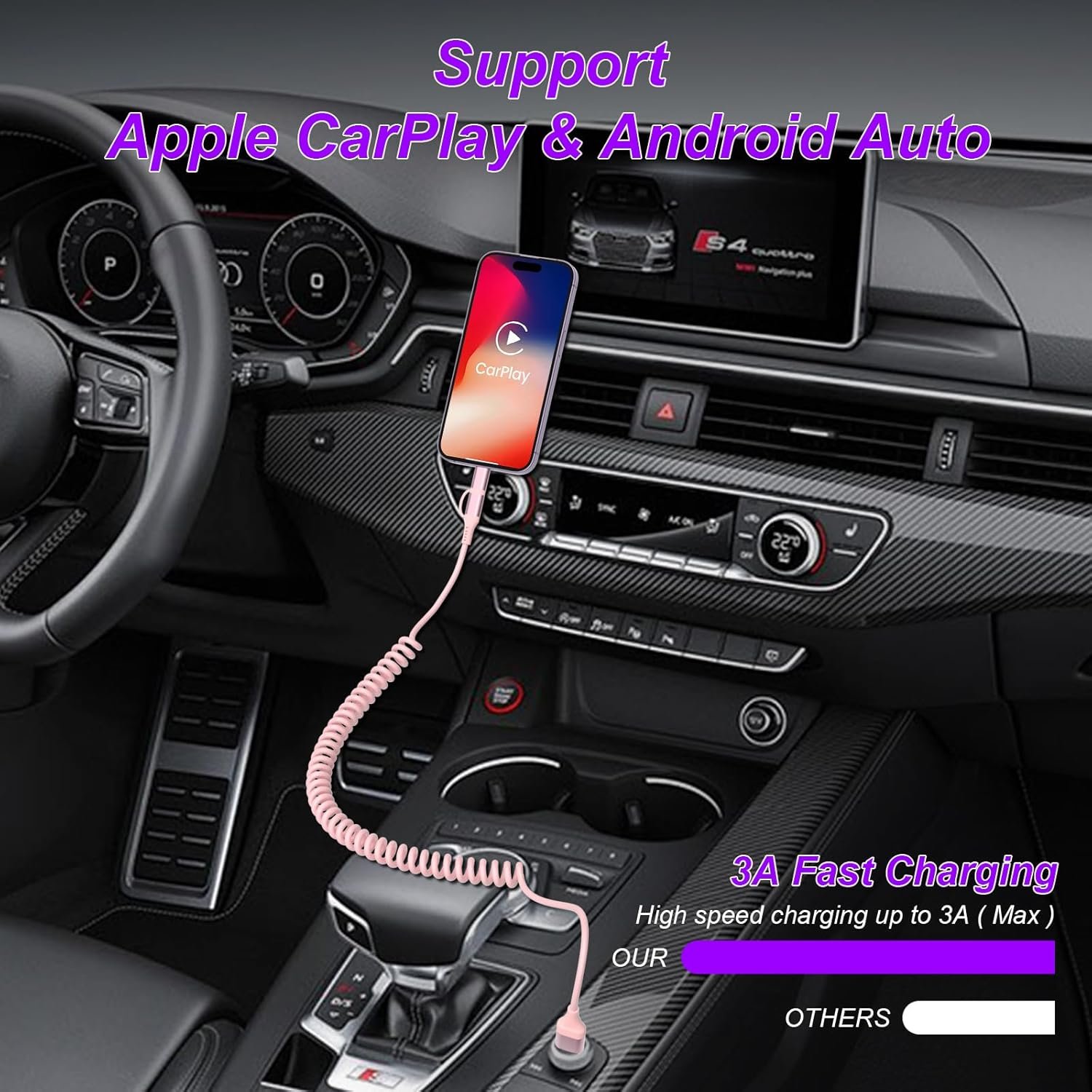 Support Apple CarPlay & Android Auto : Coiled iphone charger cable for car supports Apple CarPlay and Android Auto for simultaneous charging and navigation. Charge whatever devices your family and friends use in the car. All you need to take on the road is this one charging cable