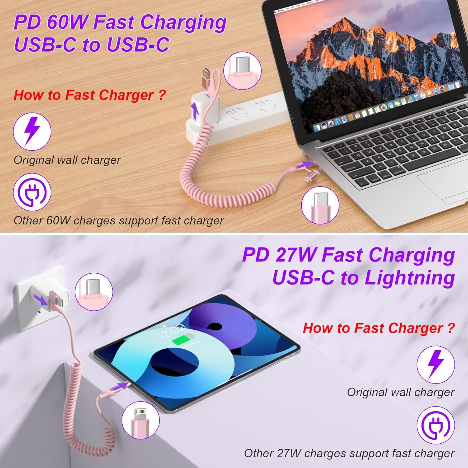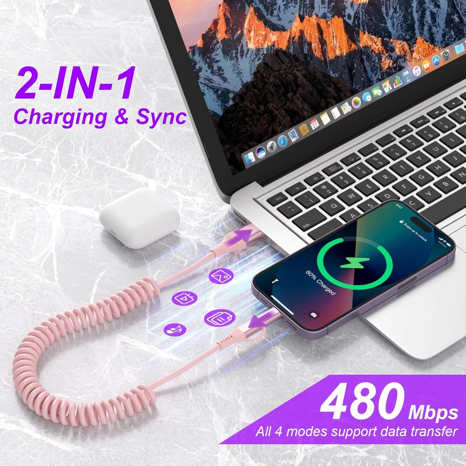 PD 60W/27W Fast Charging & Data Transfer :The coiled USB C charger cable for laptop delivers up to PD 60W of output power, with an output of 20V 3A, allowing you to fully charge a MacBooK Pro/ Air in 90 Min!(Need to use with more than 60W charger)!Type-C to lightning output power is up to 27W (9V 3A), which can charge iPhone 14 from 0% to 60% in just 30 minutes..In addition, the USB-C and Lightning cable 2-in-1 supports 480Mbps data transfer and transfers 1G files in just 20 seconds