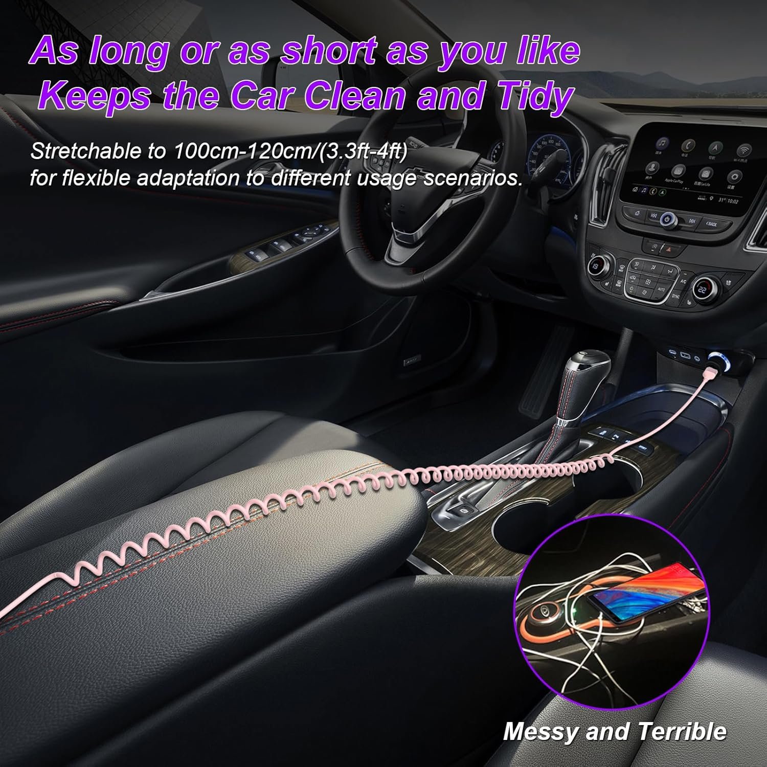 High Quality : The pink Apple Car Play cable is Apple MFi certified, with original chip, charging without error message pop-up, protect your device and safety. With retractable spring design to prevent tangling and keep your car neat and tidy