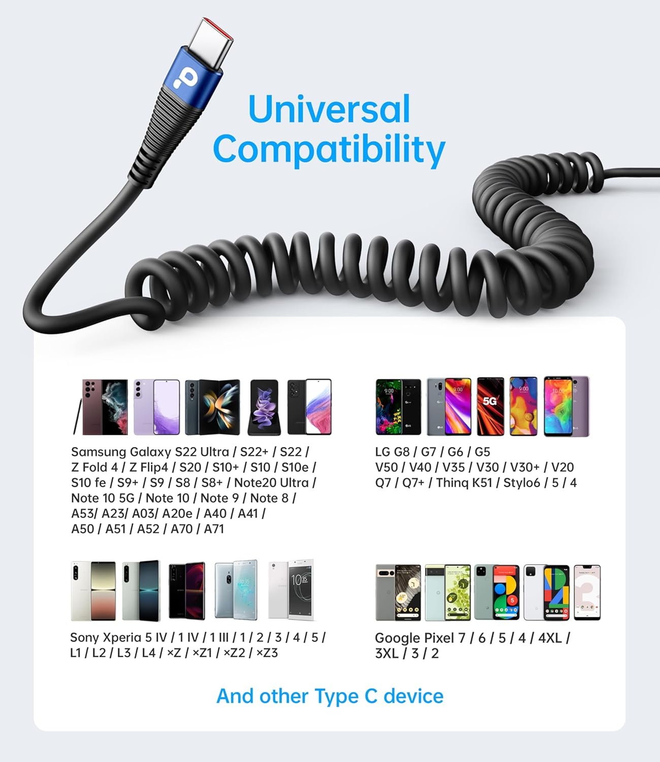 Elastic Coiled USB C to USB C Cable Made for Car: The USB Type-C cable is designed with stretchable, no tangle, no knot, and does not take up space. This coiled USB-C to USB-Ccharging cable is made of upgraded high quality PU material, which is flexible, easy to stretch, effortless, quick to rebound and not easily deformed.