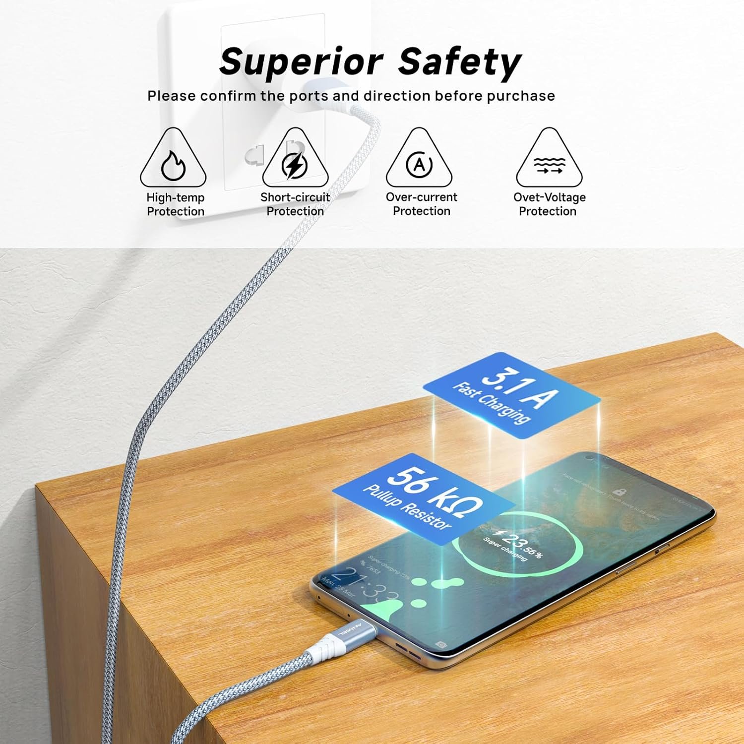 Internal 21/28 AWG thick,tinned copper core wire,plus aluminum foil signal shielding layer,built-in 56-kΩ resistor,incredible safety,protect your devices and charging adapters from damage.