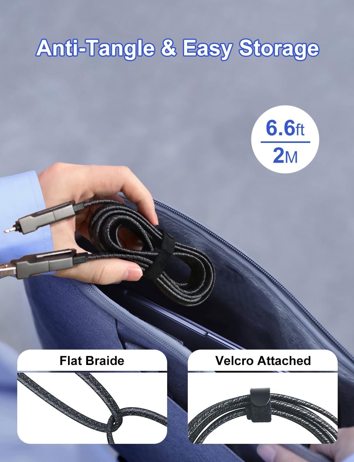 [High Quality] 4-in-1 USB C 60W fast charger cable is made of zinc alloy, which increases the strength by 700% and the life span by 10 years. The flat design of the charger cable prevents tangles and knots. In addition, the cable comes with Velcro, which keeps everything well organized when not in use.