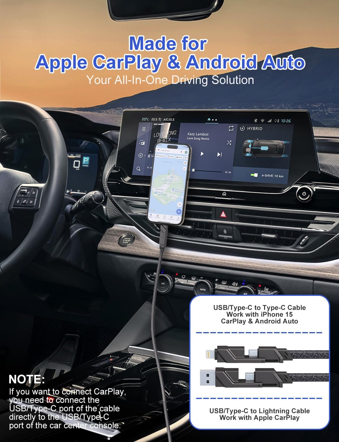 Both Lightning and USB-C ports support Apple Carplay & Android Auto