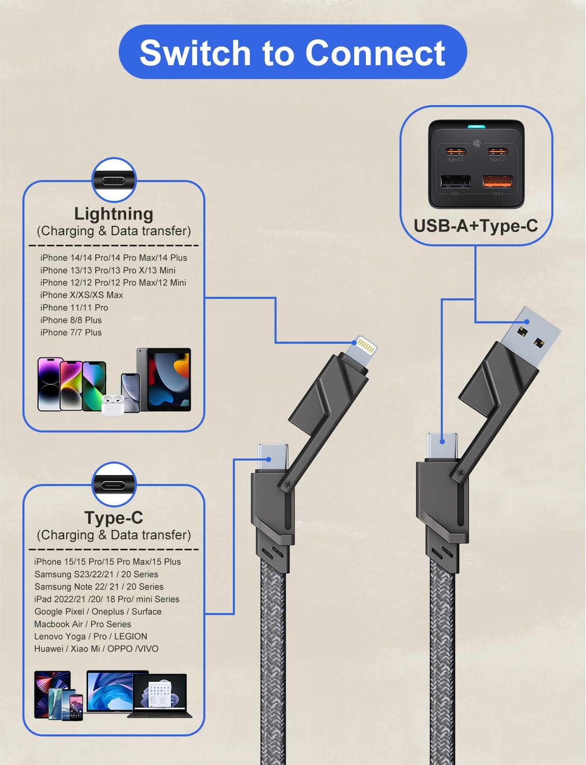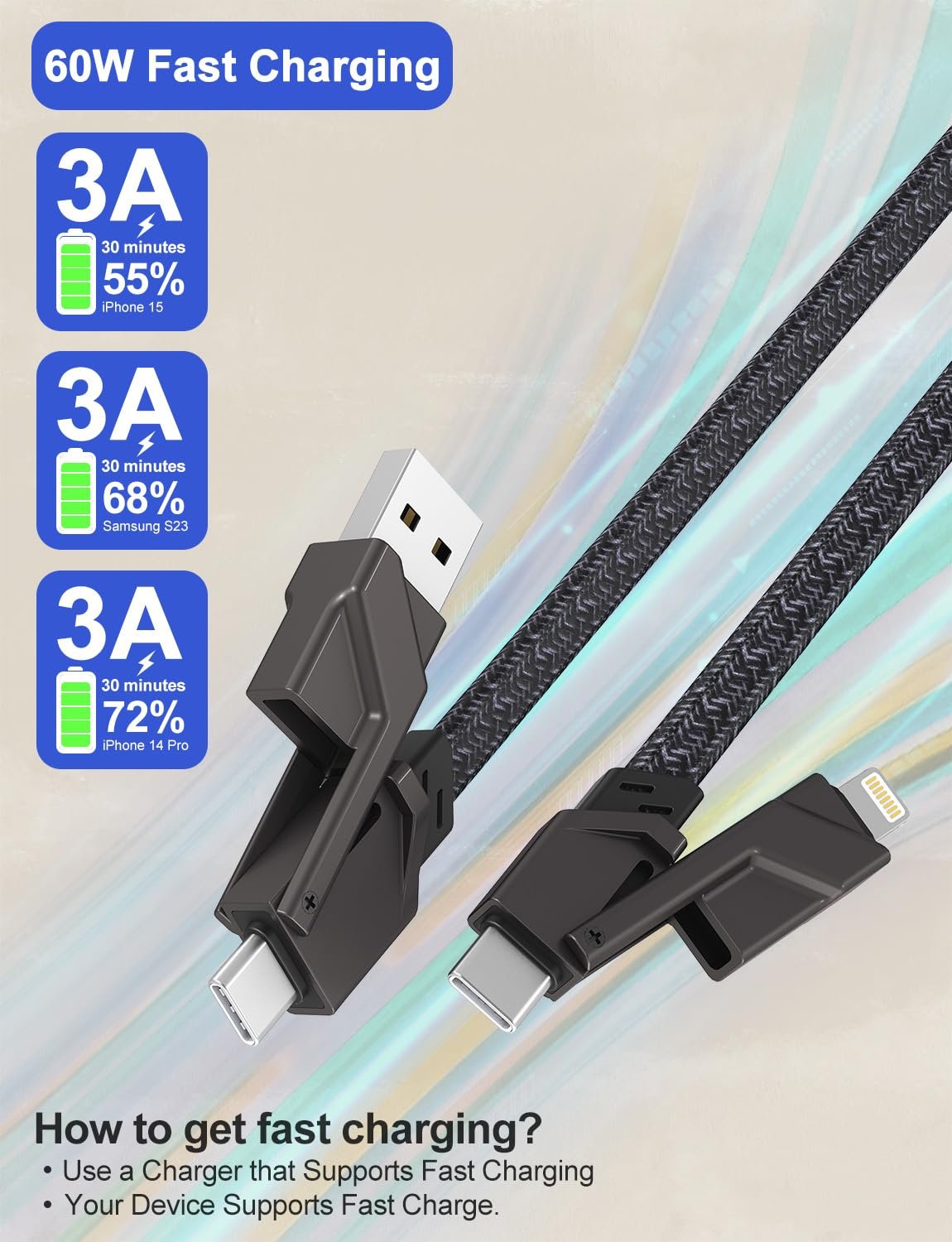 [4 in 1 Fast Charging Cable] Simplify your charging setup with our versatile 4-in-1 usb-c cable. Charge and sync your devices without the hassle of switching between multiple cables.