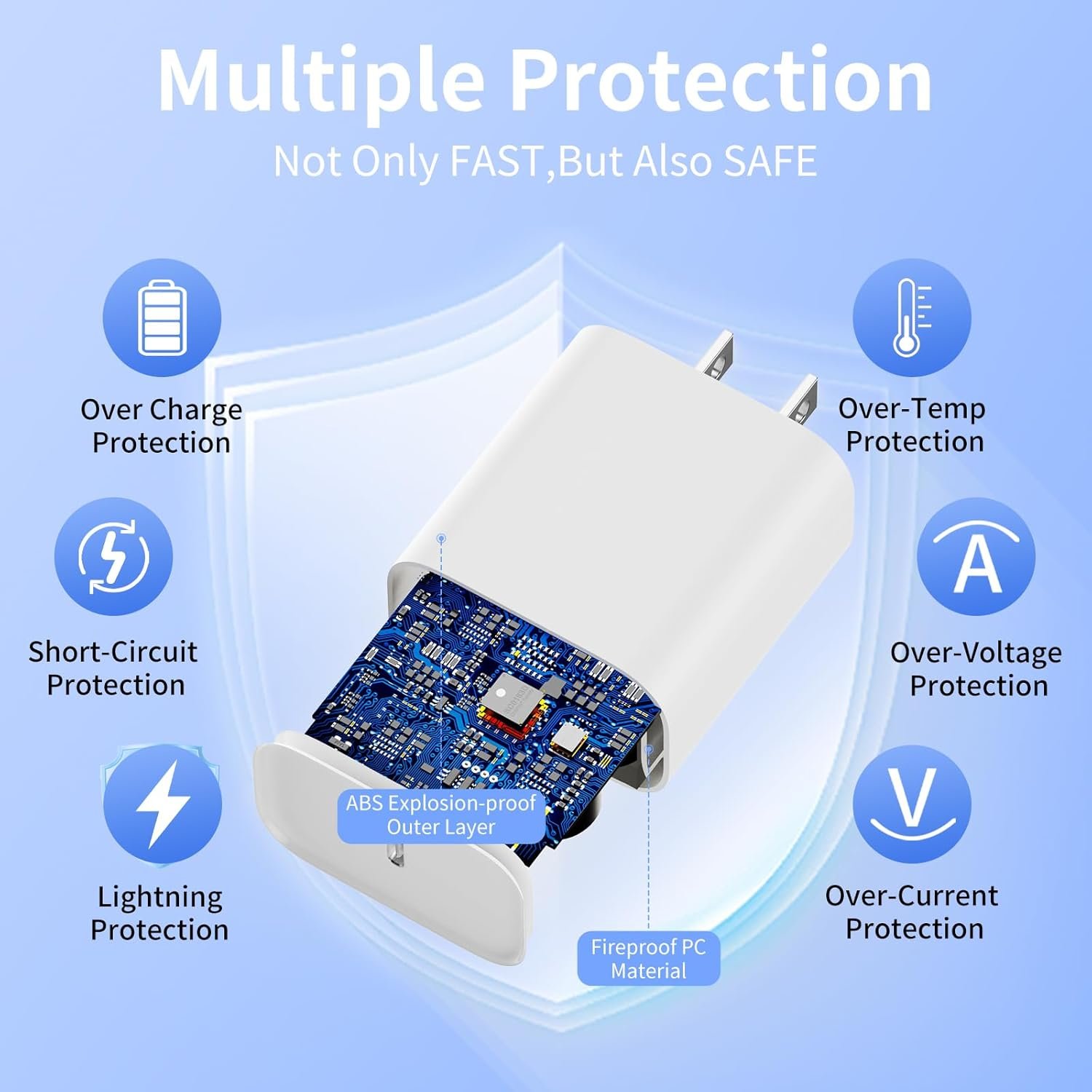 【Broad Safety Protection】This iPhone fast charger with strong and fire protection ABS+PC shell, and built-in multiple protections, avoiding overcharging, over-heat, over-voltage, over-current, short circuit issues, maximizing the life. The smart chip in the cable match the current required by the device automatically, ensuring safer and more stable charging.