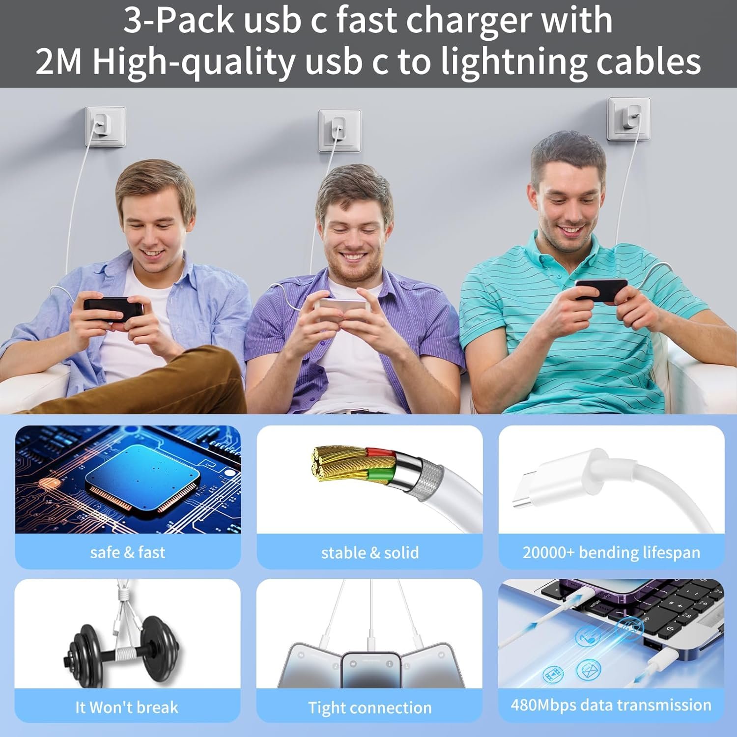 【High-quality iPhone Charger Cable】Our Updated iPhone fast charger cable has been strictly tested, including 15000+ bending test, 12000+ repeated unplugging test, load-bearing test etc., made of TPE, PVC and high-quality copper wires materials, which can withstand daily wear and tear, ensures fast and stable charging and transmission speed.